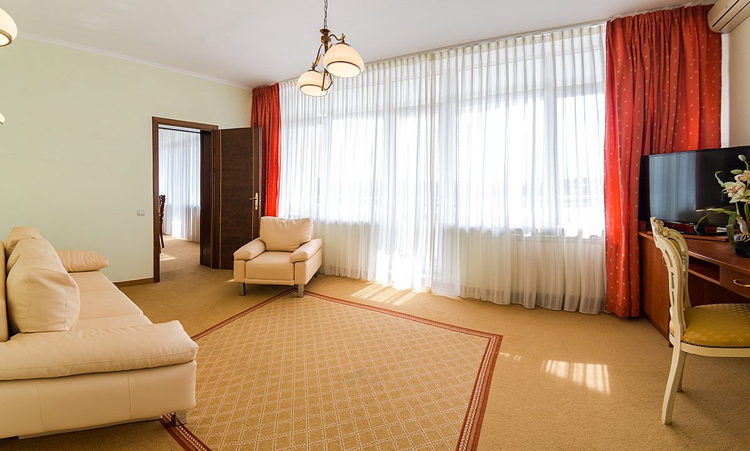 Двухкомнатный номер с балконом, состоящий из небольшой гостиной и спальни. Номер удобен для семей, которым для полноценного отдыха нужны две комнаты.
