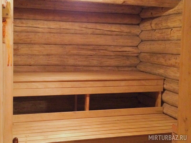 Настоящая русская баня вмещает в себя до 8-ми человек, состоит из просторных предбанника, моечной и жаркой парилки. Отделка опять же выбрана самая что ни на есть природная — зачищенные бревна, интерьер также полностью деревянный.