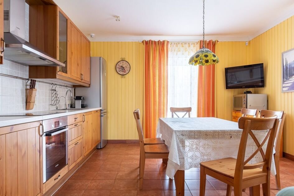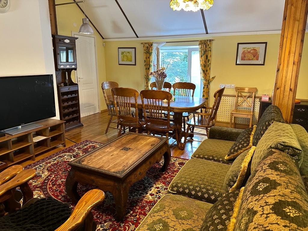 Вы сможете наслаждаться временем на просторной лужайке и большой деревянной террасе с уличной мебелью( зимой мебель с улицы убирается), идеальной для семейных чаепитий и вечерних посиделок в гамаке под звездным небом.