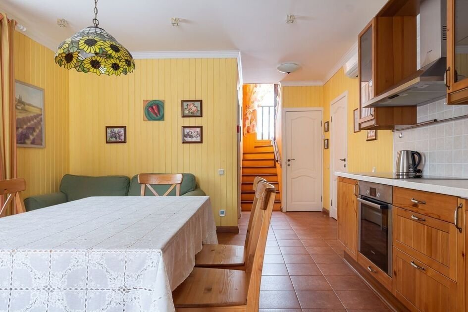 Интерьер выполнен в теплых тонах, создавая атмосферу домашнего уюта. На территории есть крытая зона барбекю со всем необходимым оборудованием.