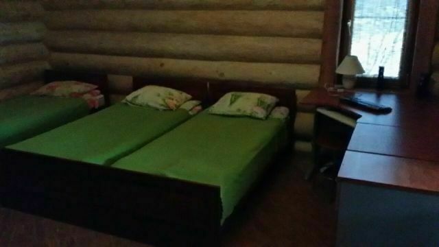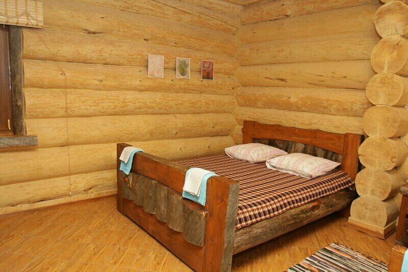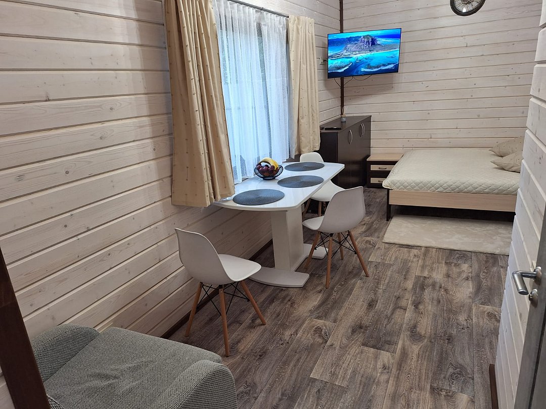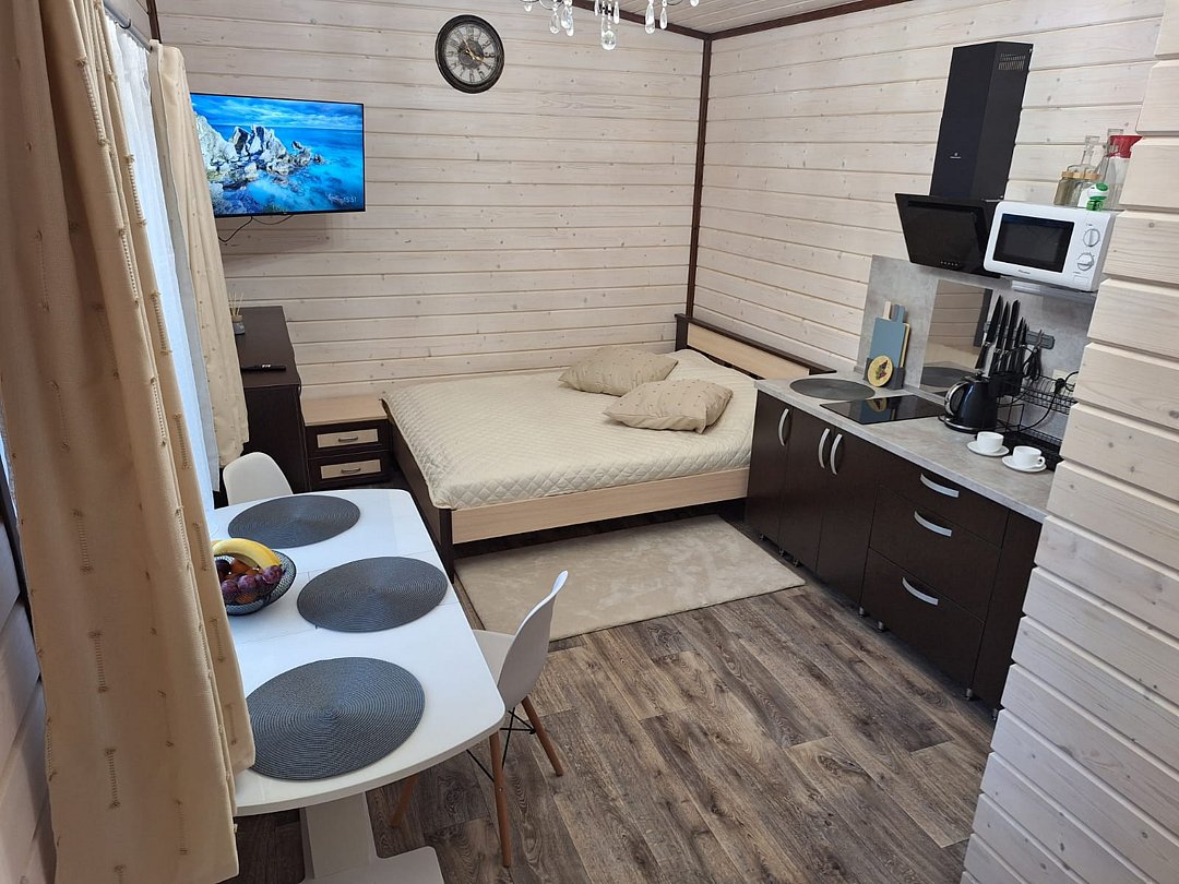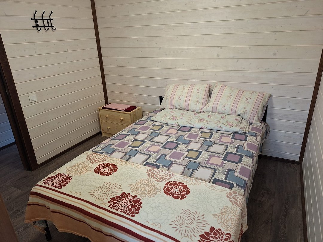 Небольшой двухместный коттедж из бревна. Мини кухня (свч, чайник, холодильник, плита), ТВ, полный санузел, двуспальная кровать.