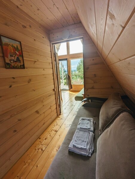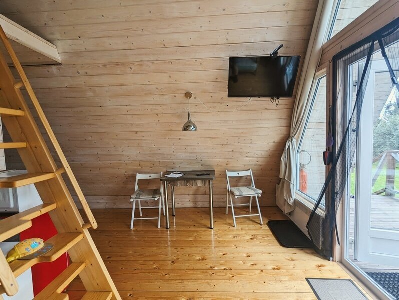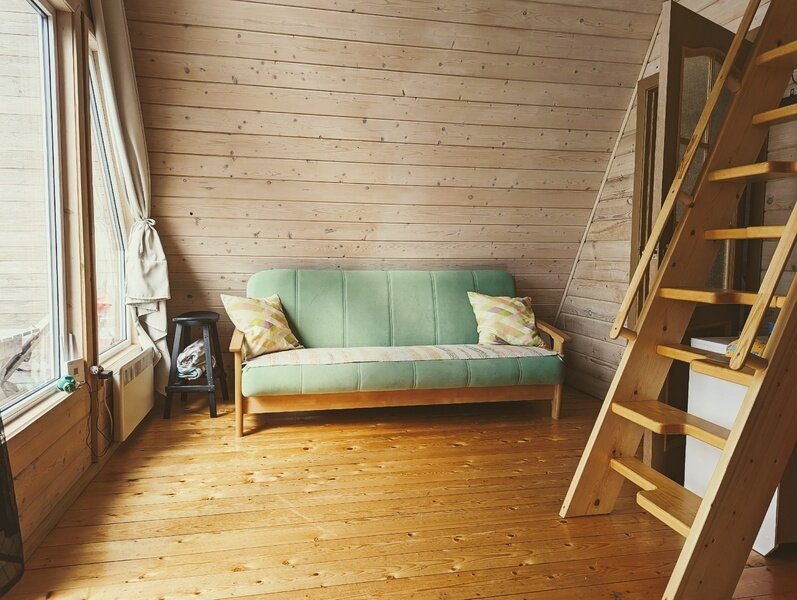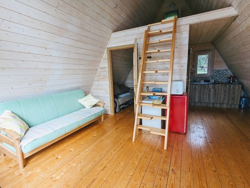 Максимальное количество гостей 6 (спальное место — лофт 200 на 200 + два раскладных двухместных дивана). По запросу предоставят настольные игры. На территории есть мангал.
