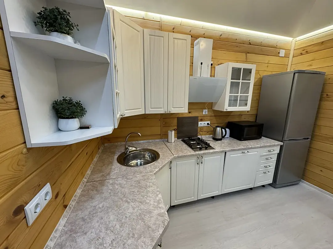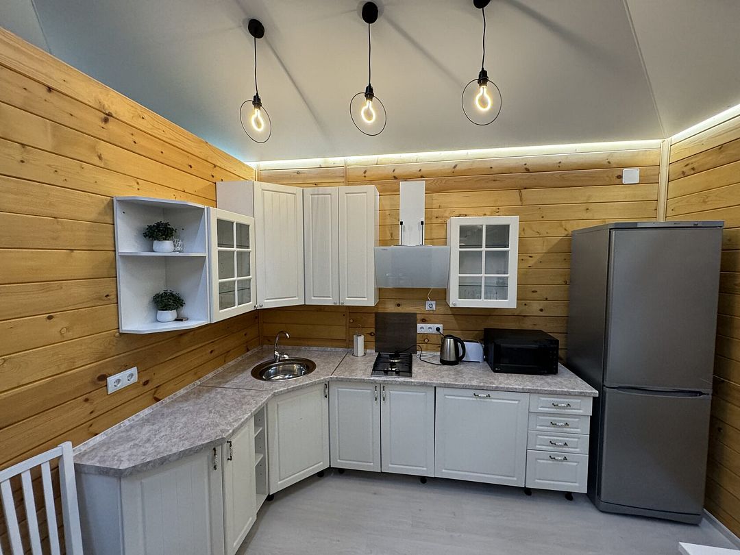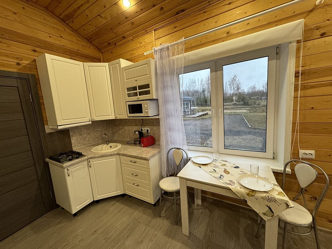 Также в доме есть кухня со всем необходимым для готовки — большой холодильник, духовой шкаф, посудомоечная машина, газовая плита, микроволновая печь, тостер, чайник, сковороды и кастрюли, сервировочная посуда и столовые приборы. Рядом с домом расположен мангал.