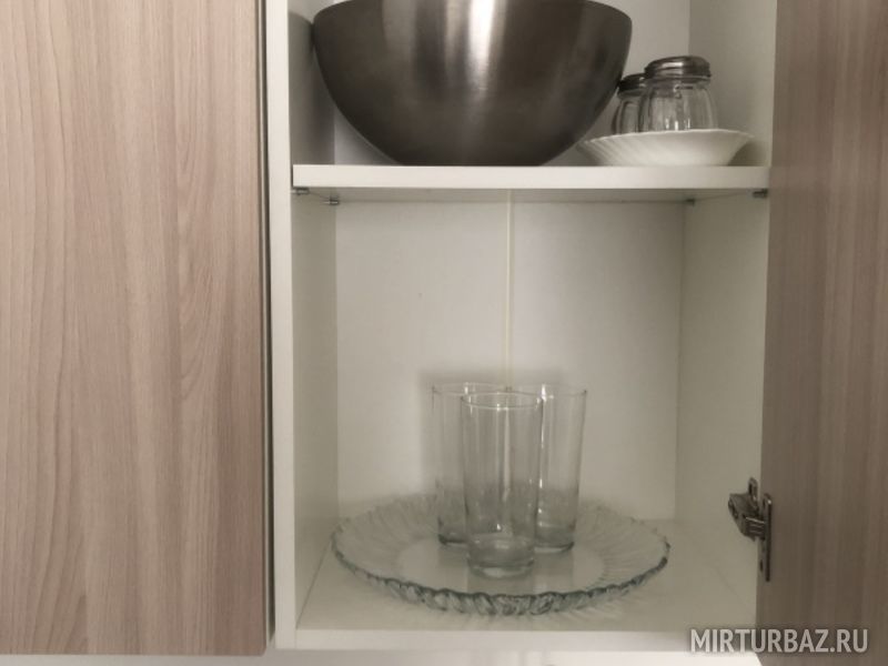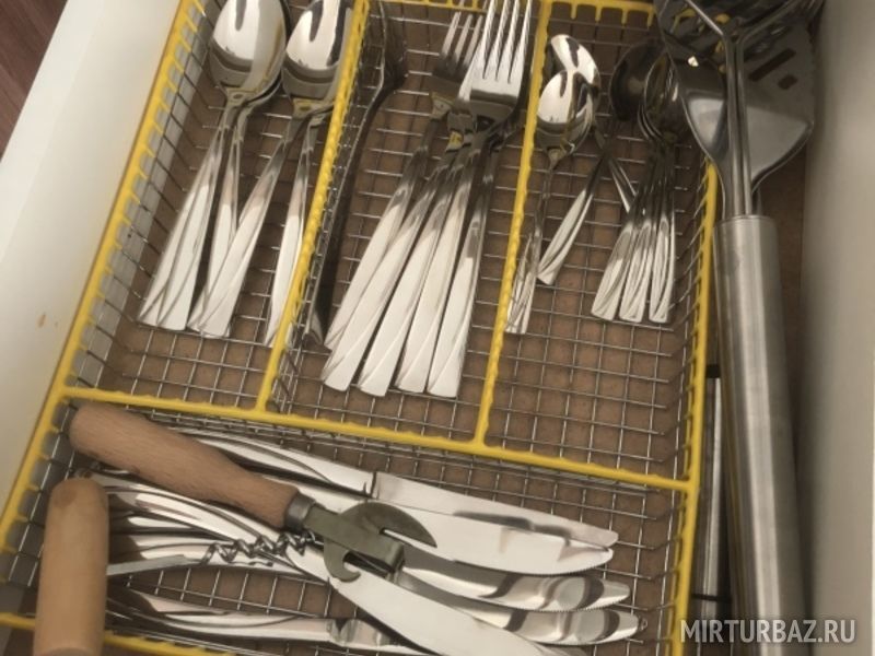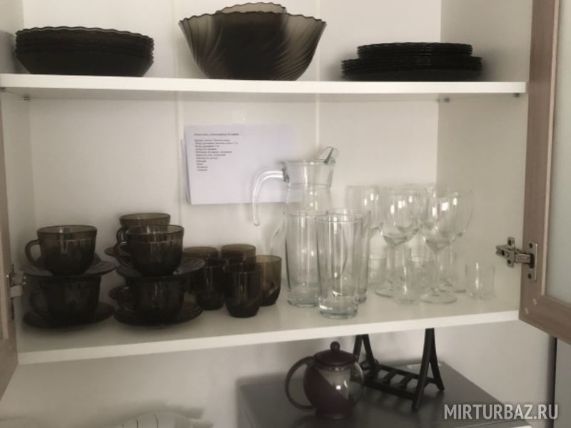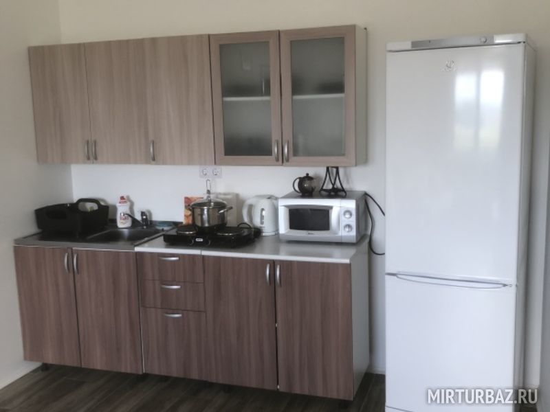 В кухонной зоне располагается холодильник, кухонный гарнитур, мойка, электрическая плитка, микроволновая печь, электрический чайник, набор посуды на 6 персон, также вся необходимая для приготовления пищи посуда вплоть до самых мелочей, что позволяет устроить застолье к любому празднику.