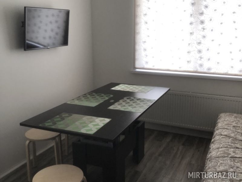 В гостиной зоне располагается диван, который разбирается в полноценное двуспальное место, кресло, журнальный столик, который раздвигается в большой обеденный стол, комод, телевизор (Триколор).
