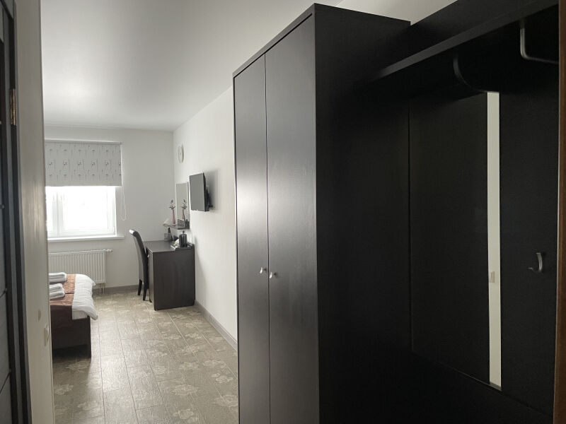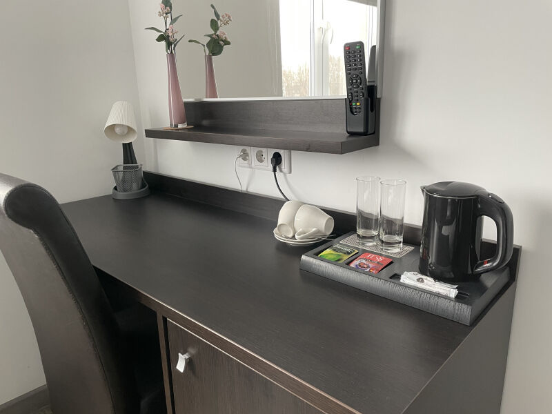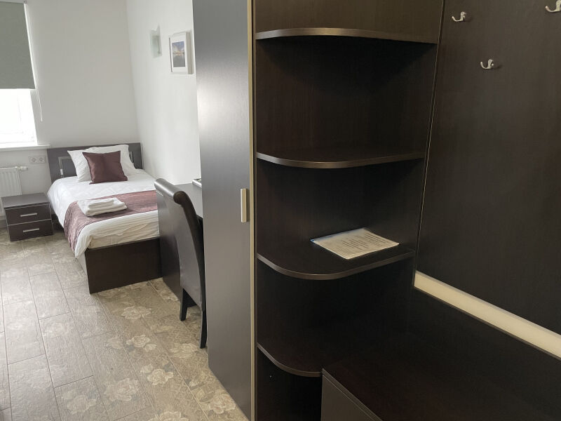 Wi-Fi, Телевизор, Две односпальные кровати, Рабочий стол, Настольная лампа, Мини-бар, Чайник, Чайный набор, Прихожая, Тумба для багажа, Вешалки, Шкаф, Кресло-кровать, Зеркало, Тумбы.