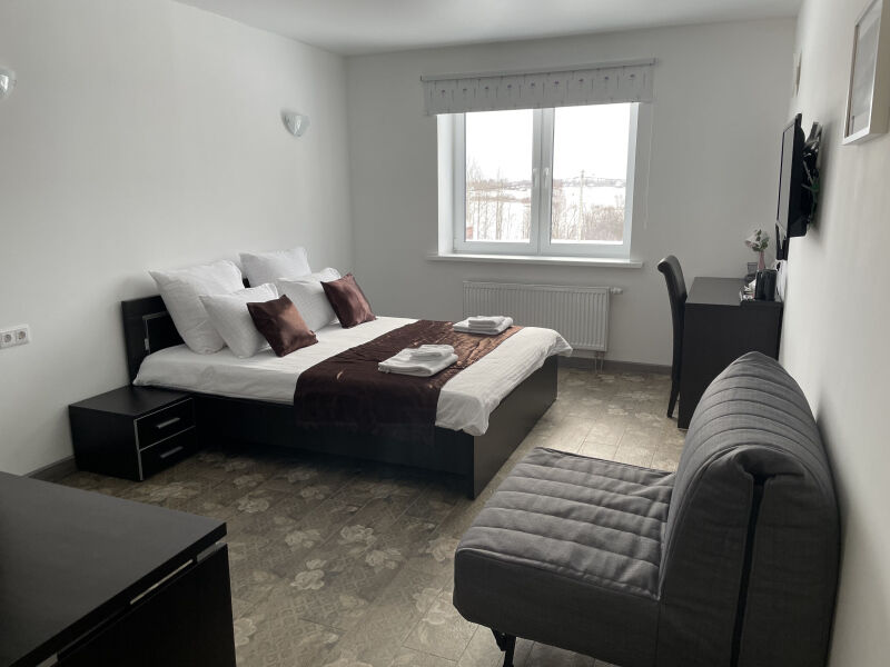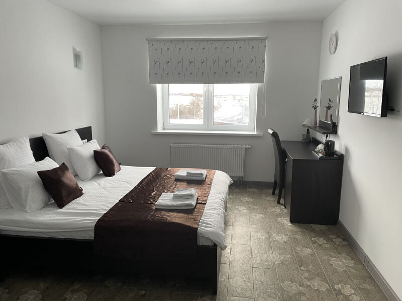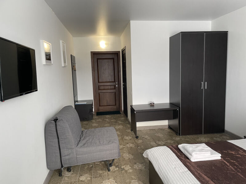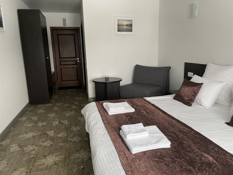 Комфортный просторный номер с двуспальной кроватью для проживания одного-двух человек, или семьи с ребенком. Два основных места + 1 дополнительное место (оплачивается дополнительно).