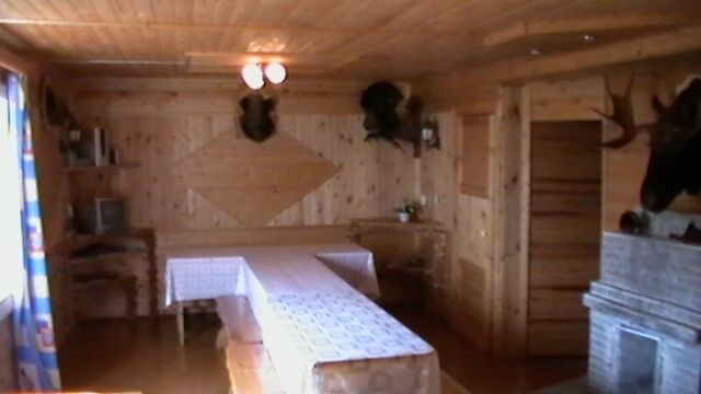 В гостевом доме имеется просторный каминный зал и две спальни на восемь мест. Кроме этого на первом этаже расположены санузел и кухня с необходимым для проживания инвентарем. На втором этаже находятся летняя спальня и комната-музей «Охота и рыбалка».