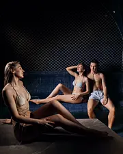 Главная сауна курорта вмещает до 100 человек, поддерживая температуру 75 °C, и идеально подходит для групповых парений Ауфгусс.