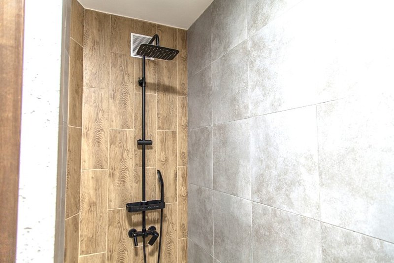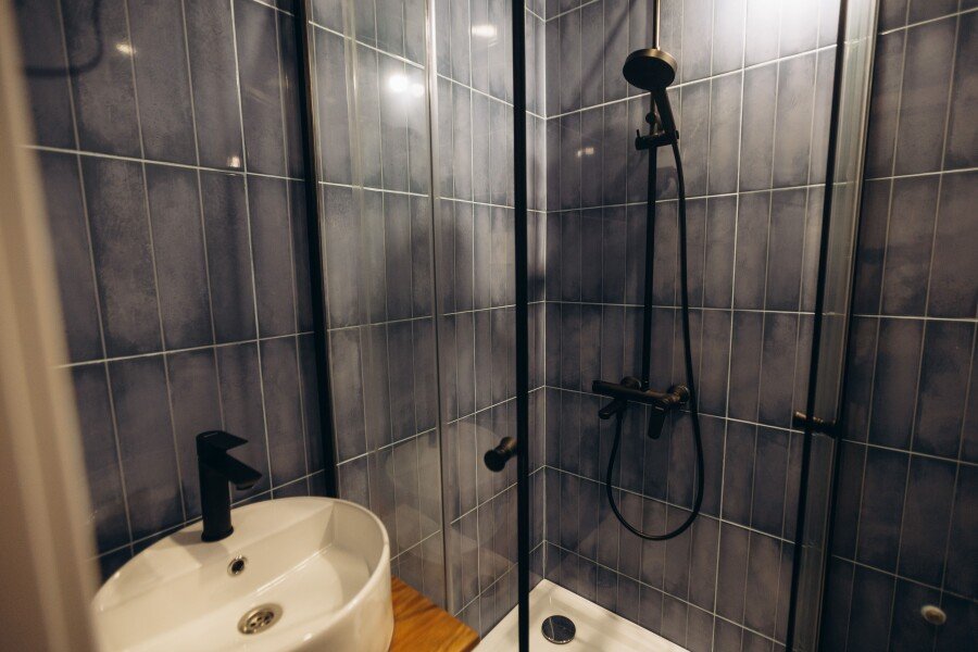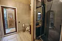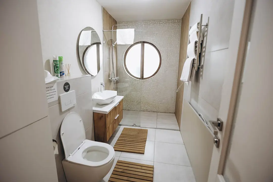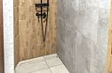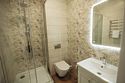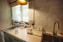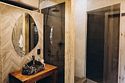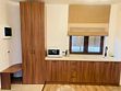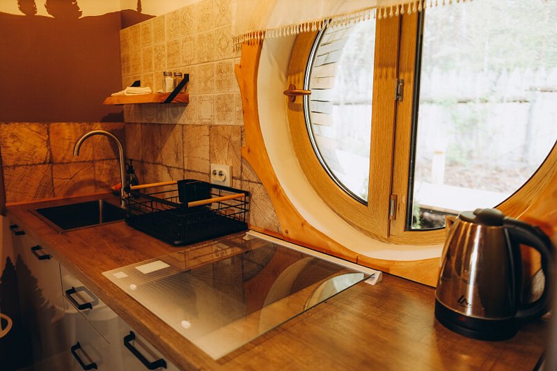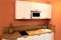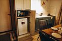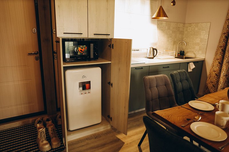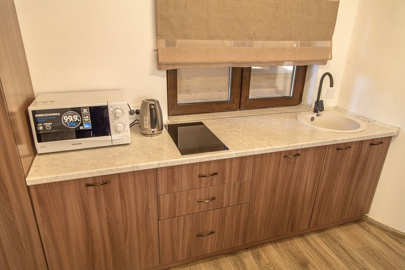 Кухонный уголок с чайником, холодильником, микроволновкой, комплектом посуды. Варочная поверхность не предусмотрена. Санузел с душем и раковиной.