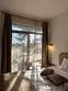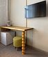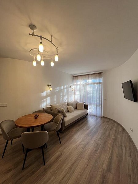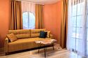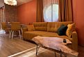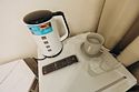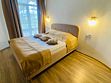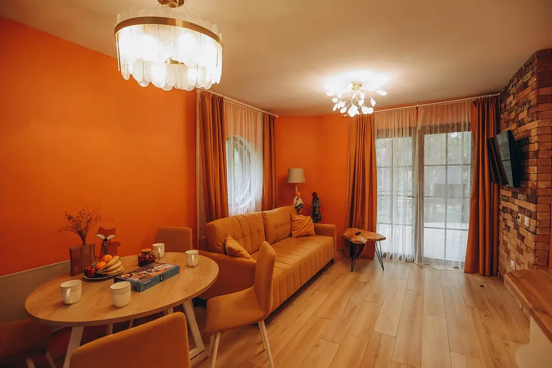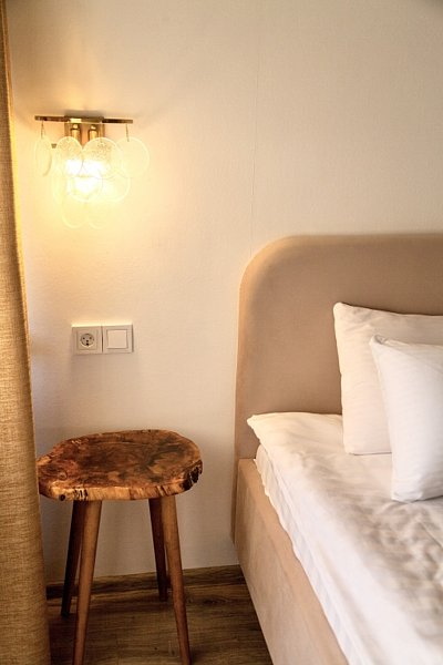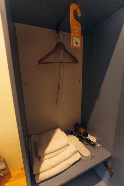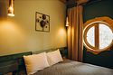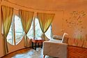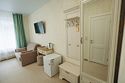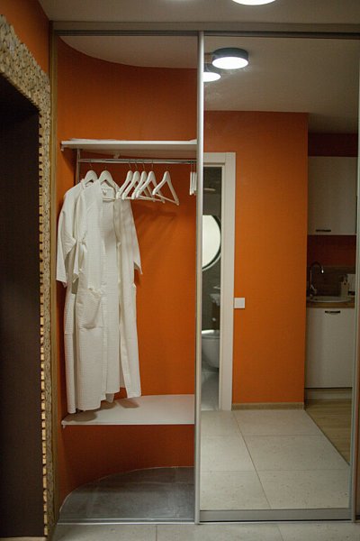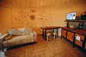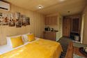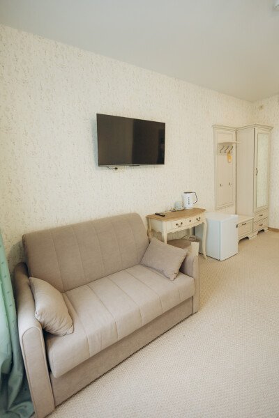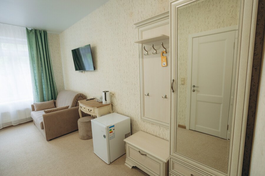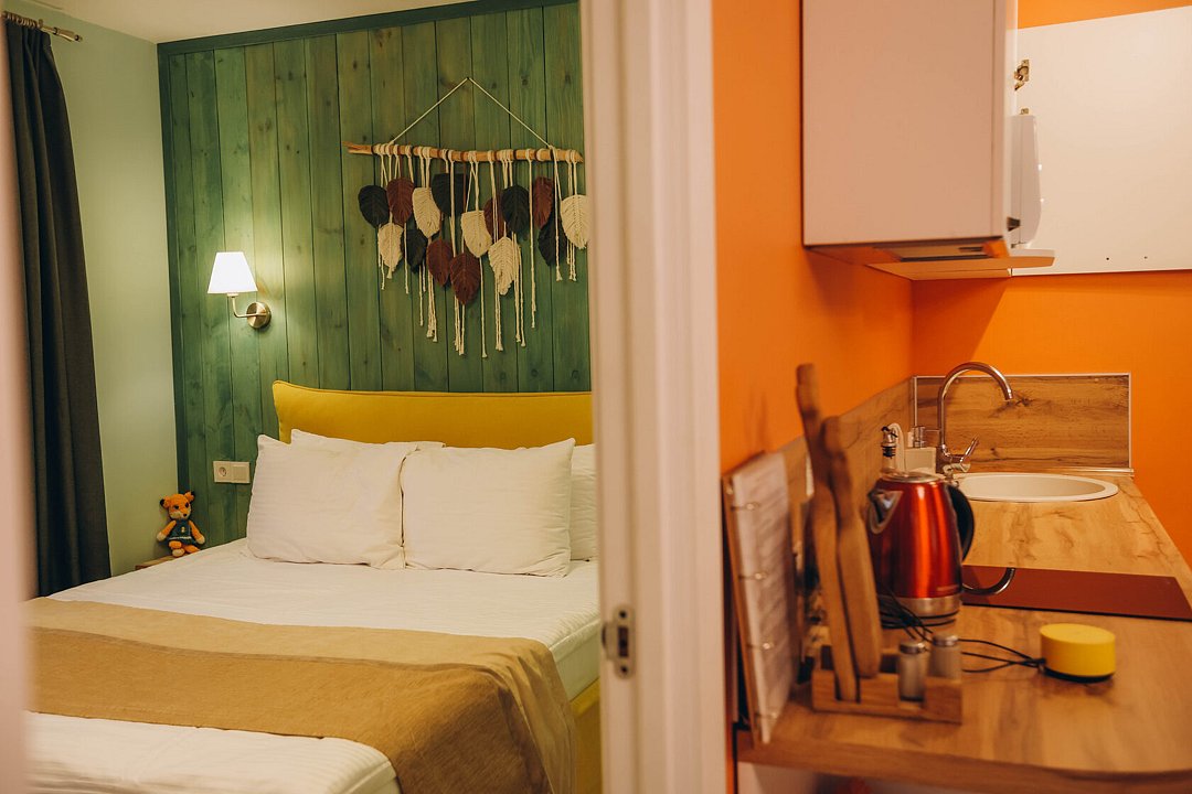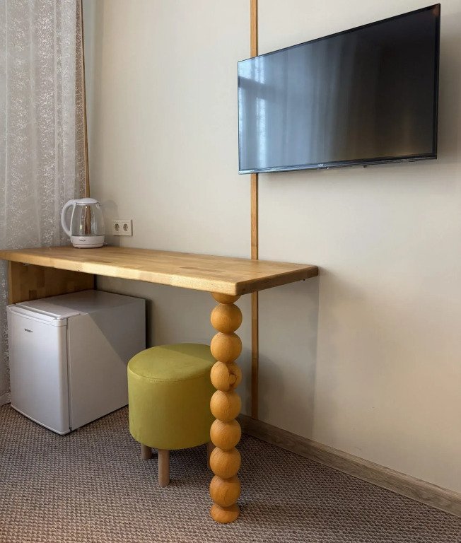 Оснащение: Шкаф для вещей, двуспальная кровать, (которая трансформируется в две односпальные), стол и пуфик, телевизор, мини холодильник и чайник. Варочная поверхность не предусмотрена.