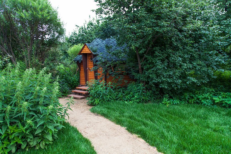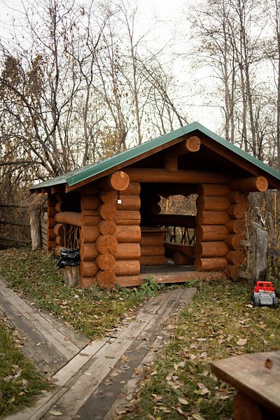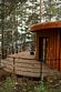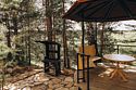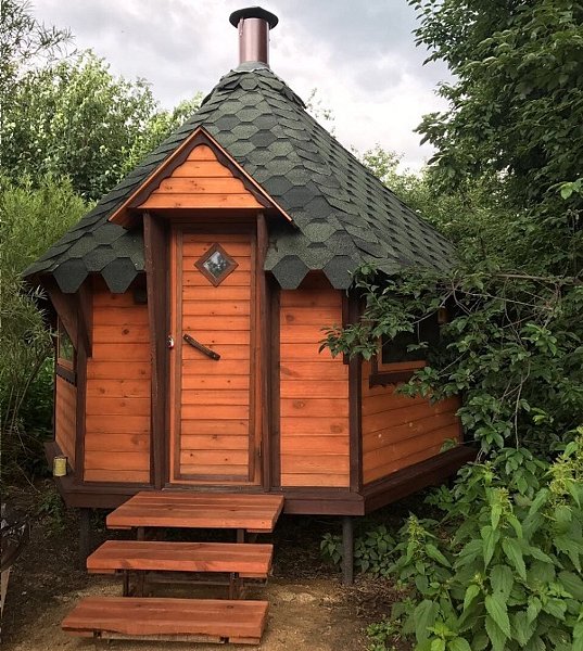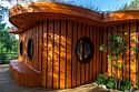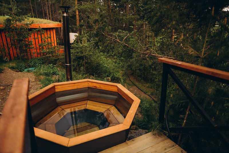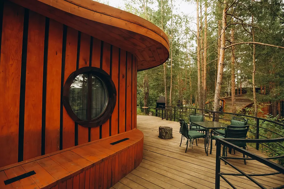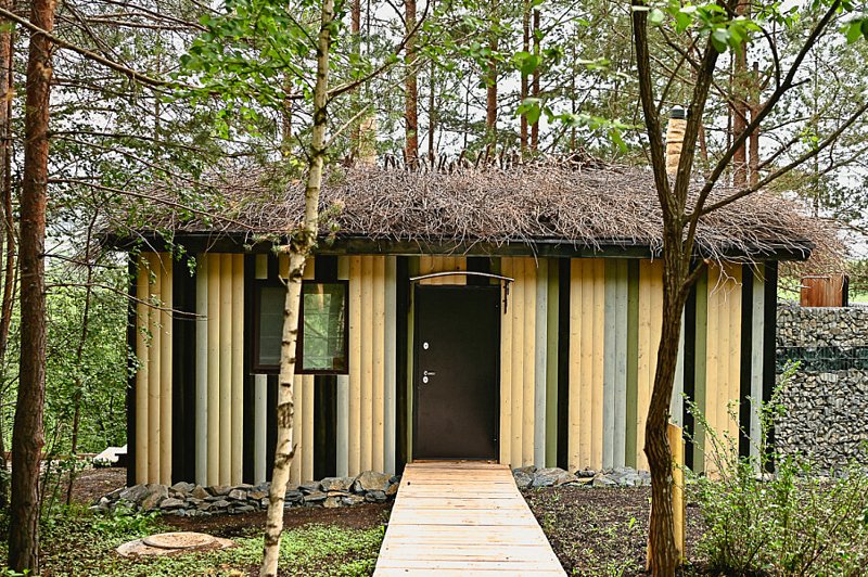 Уютный дом в стиле природного жилища ондатры с панорамной верандой, дополнительным летним душем и уличной ванной, работающими в теплое время года.