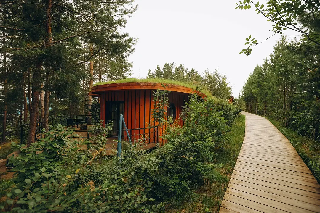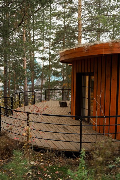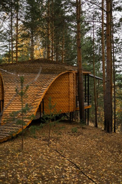 Двухкомнатный дом до 4-х человек с уникальным дизайном в форме птицы и с панорамным видом на сосновый лес.