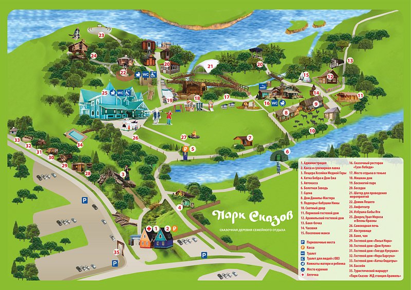 Парковка Парка рассчитана на 400–450 машиномест. Адрес в навигаторе: Свердловская область, пос. Арамиль, ул. Парк Сказов, д. 1.