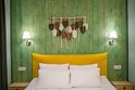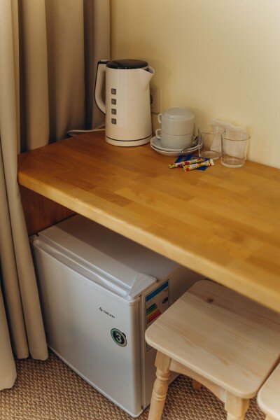 Большой номер до 4-х гостей от 20 кв.м.. Оснащение: Шкаф для вещей, двуспальная кровать, (которая трансформируется в две односпальные) и 2 дополнительных места на раскладывающимся диване, барный стол и 2 стула. Чайник, мини - холодильник, комплект посуды для чая.