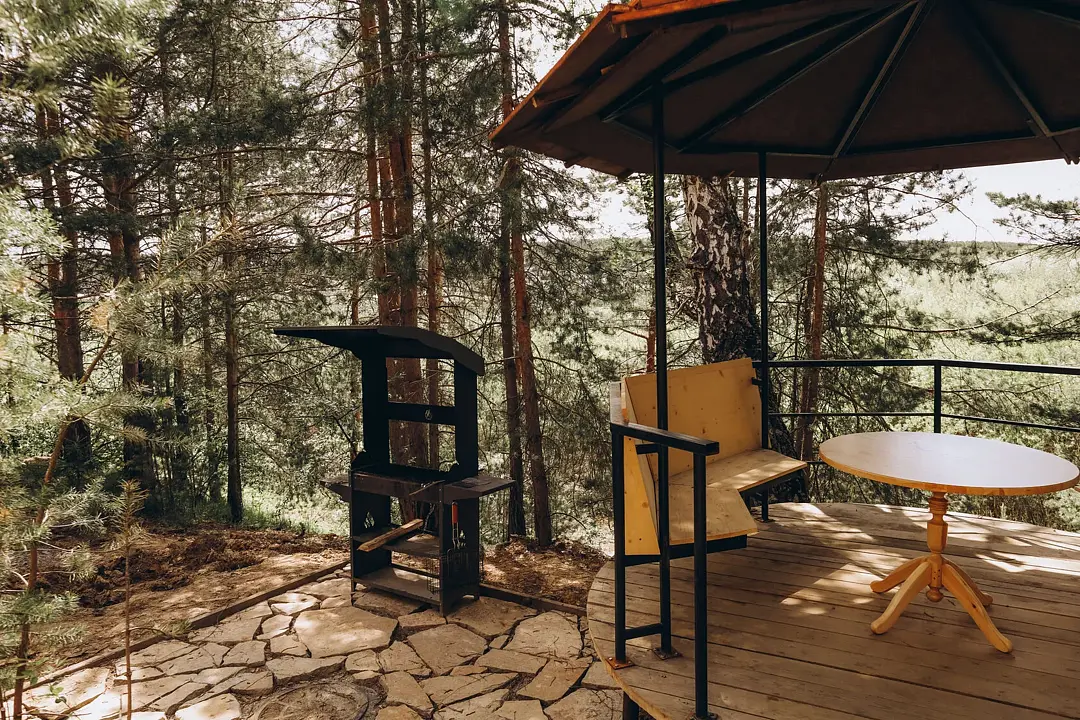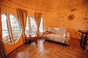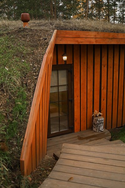Большой дом в стилистке природной норы барсука, рассчитанный до 6 человек, с панорамной беседкой и мангальной зоной.