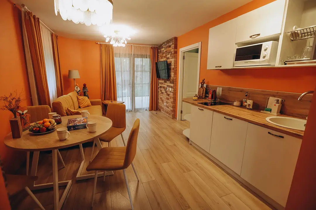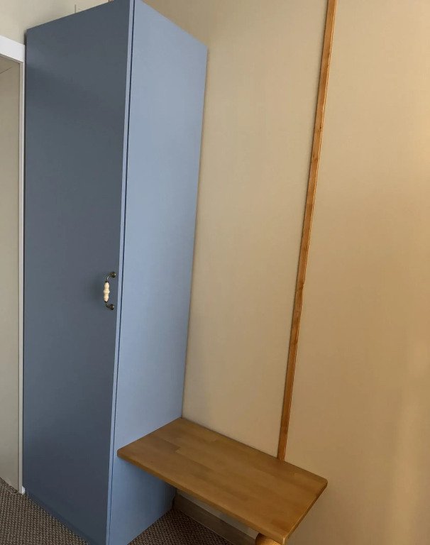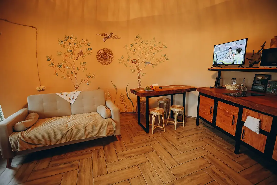 Оснащение: Шкаф для вещей, (которые трансформируется в две односпальные), стол и пуфик, телевизор, мини холодильник и чайник. Варочная поверхность не предусмотрена.