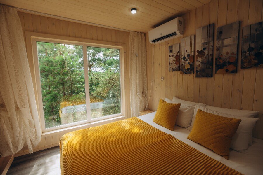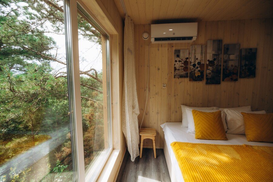 Уютный, модульный домик 23,8 м² для двоих, с панорамным окном, в окружении сосен. Оснащение: шкаф для вещей, двухспальная кровать, (которая трансформируется в две односпальные), барный стол и 2 стула.