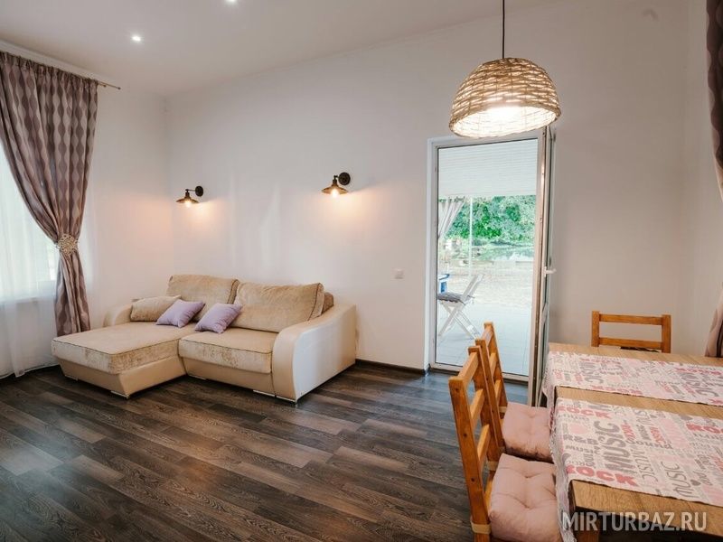 В коттедже две спальни, кухня, гостиная, санузел, коттедж оснащен всем необходимым для проживания, холодильник, варочная панель, микроволновая печь, эл. чайник, сплит система, холл, горячая вода, посуда, из коттеджа есть выход на террасу полностью укомплектованной садовой мебелью, мангальная зона.