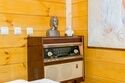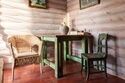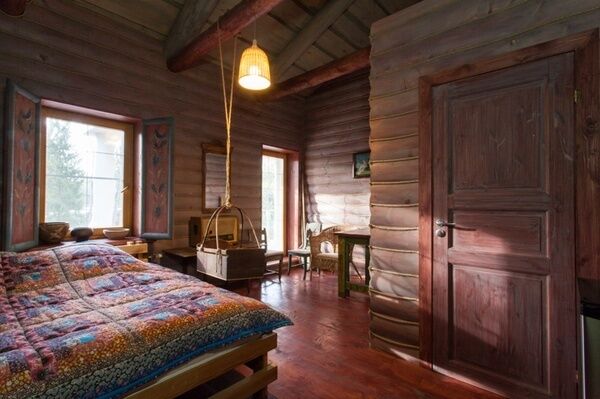 Установка на аутентичность выразилась в образе старинной русской избы со стенами из натуральных бревен. Оформление комнаты выполнено в естественных цветах, предметы выглядят потертыми, не новодельными.
