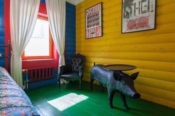Акцент в оформлении комнаты сделан на правильных арт-объектах. Самый заметный из них - черная хрюшка знаменитой голландской компании mooi, символизирующая успешное сочетание традиционных деревенских атрибутов (к коим относится свинья) и современного дизайна.