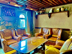 Деревянные панели придают номеру атмосферу античного духа Боспорского царства. Номер с видом на море расположен на первом этаже.