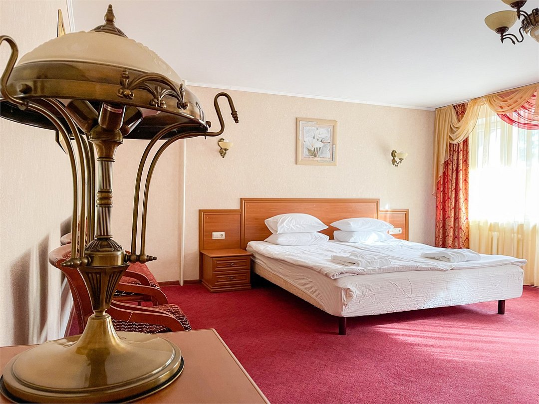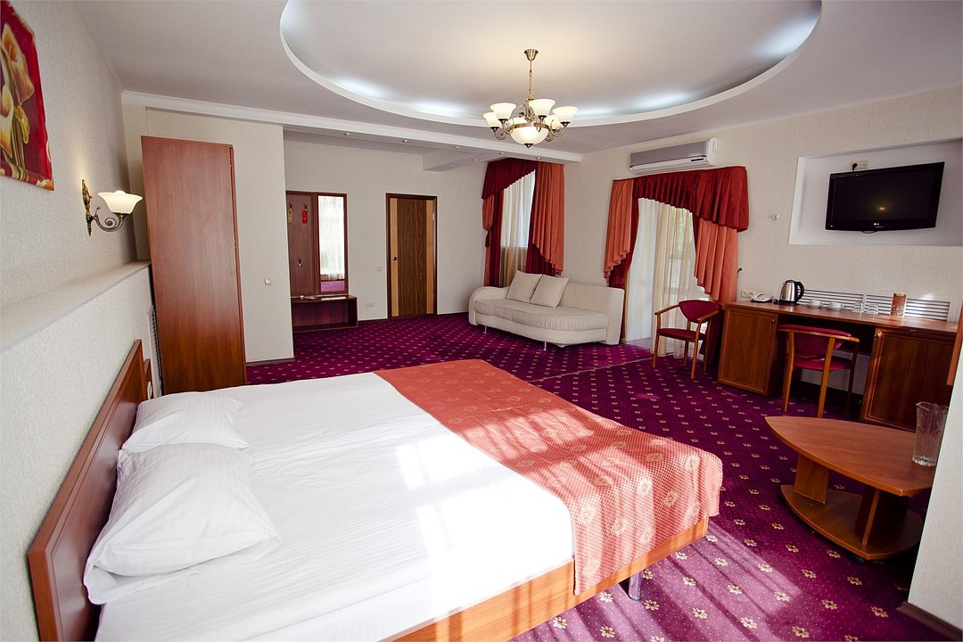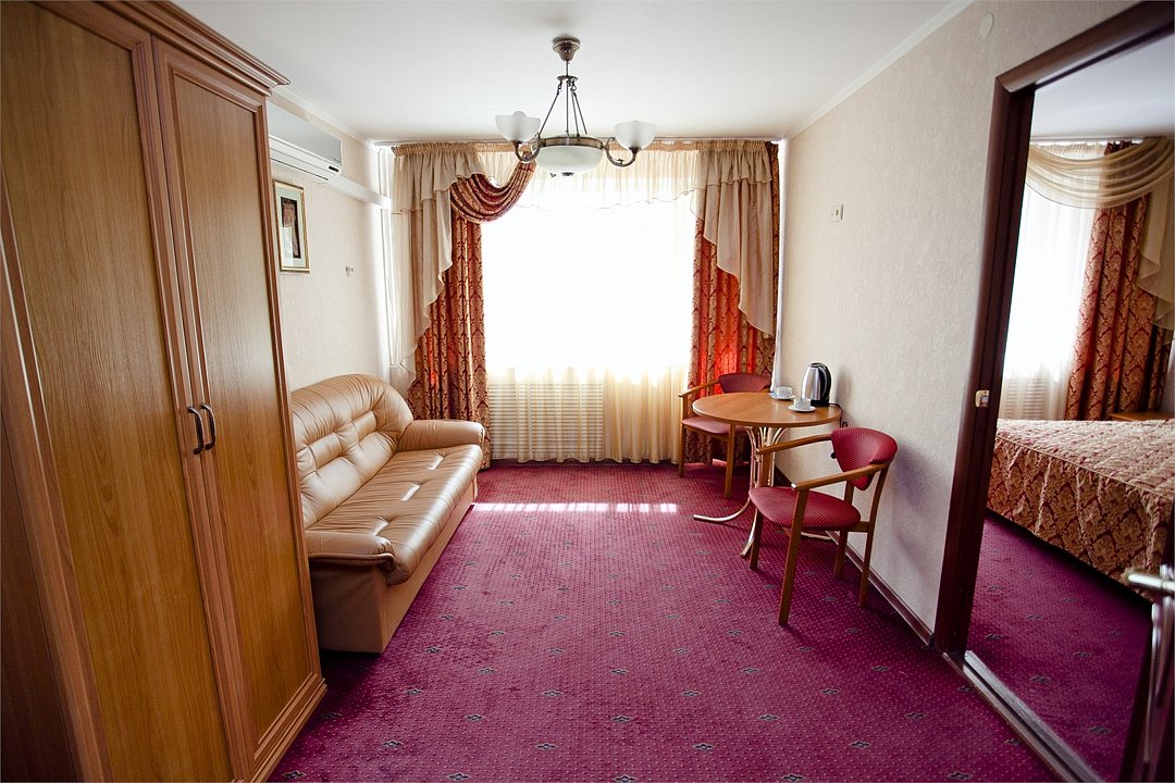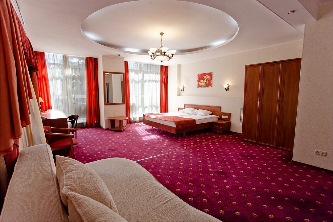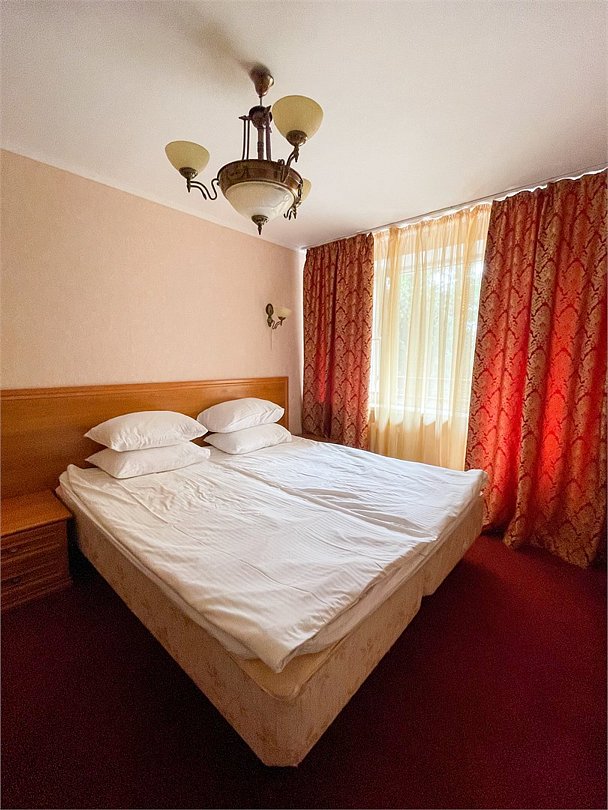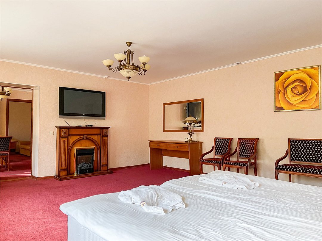 Двухкомнатный номер площадью 31 кв.м. В номере: Двуспальная кровать "King size" (180*200), туалетный стол с зеркалом, полка для багажа, телевизор, телефон, холодильник, стол, 3 стула, шкаф, диван, ванна, биде, фен, туалетные принадлежности, махровый халат, тапочки.Услуги и удобства