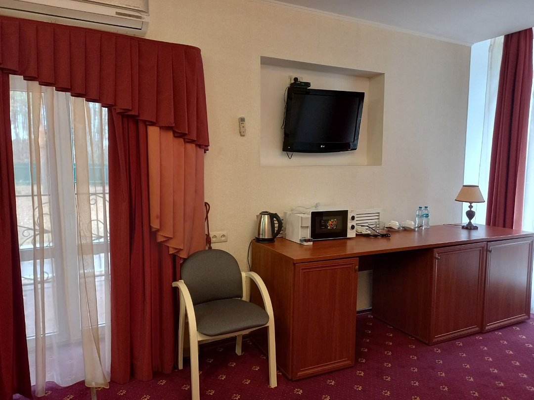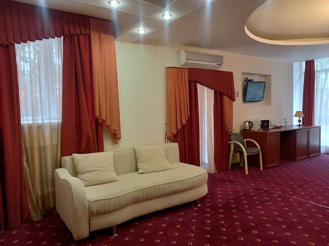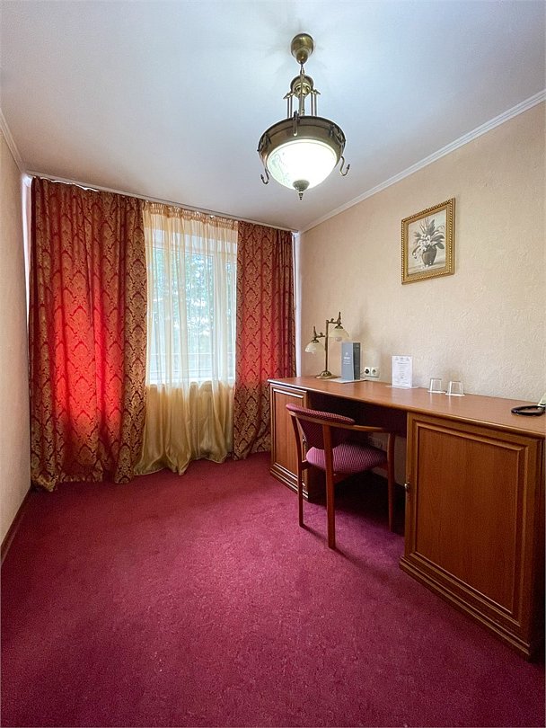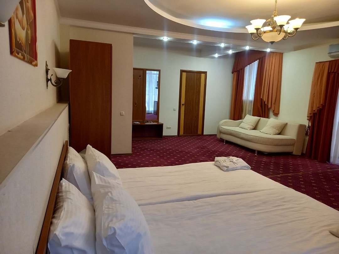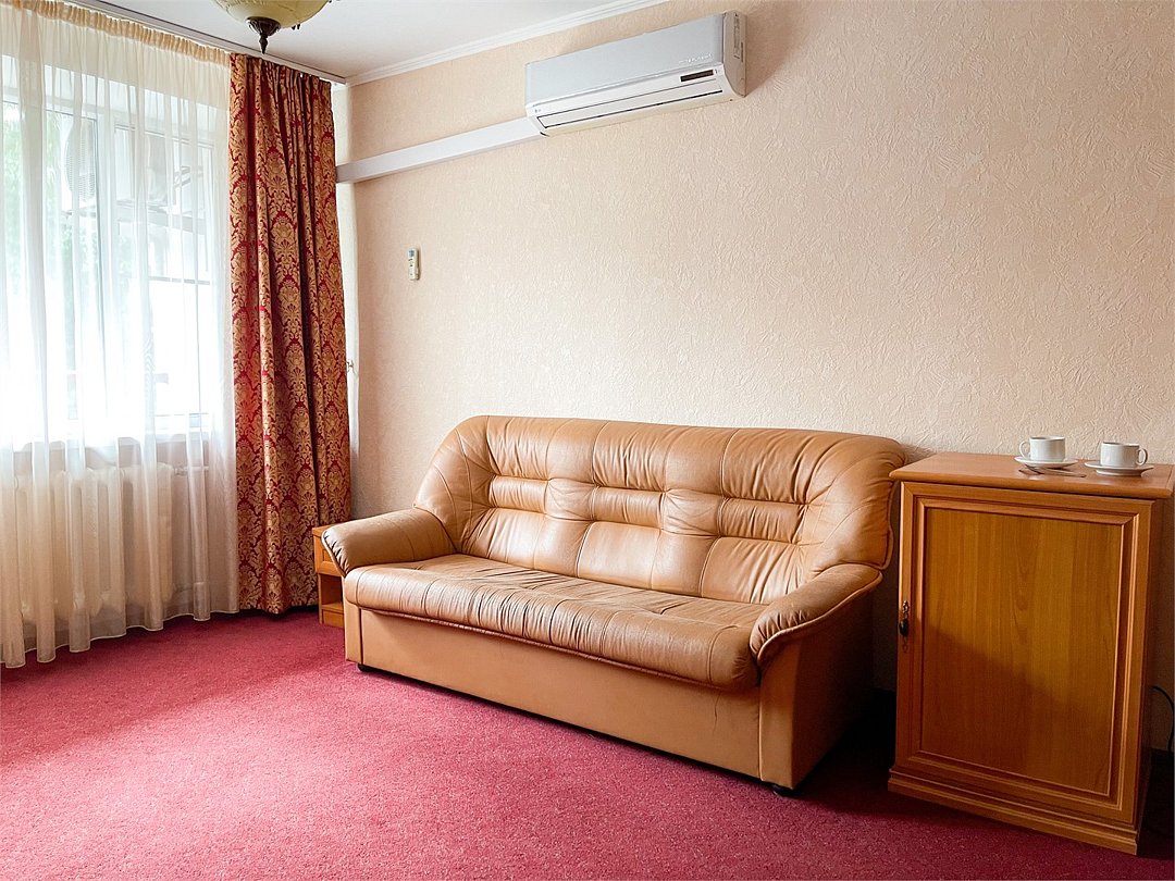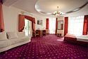 Двухкомнатный номер площадью 31 кв.м. В номере: Двуспальная кровать "King size" (180*200), туалетный стол с зеркалом, полка для багажа, телевизор, телефон, холодильник, стол, 3 стула, шкаф, диван, ванна, биде, фен, туалетные принадлежности, махровый халат, тапочки.Услуги и удобства
