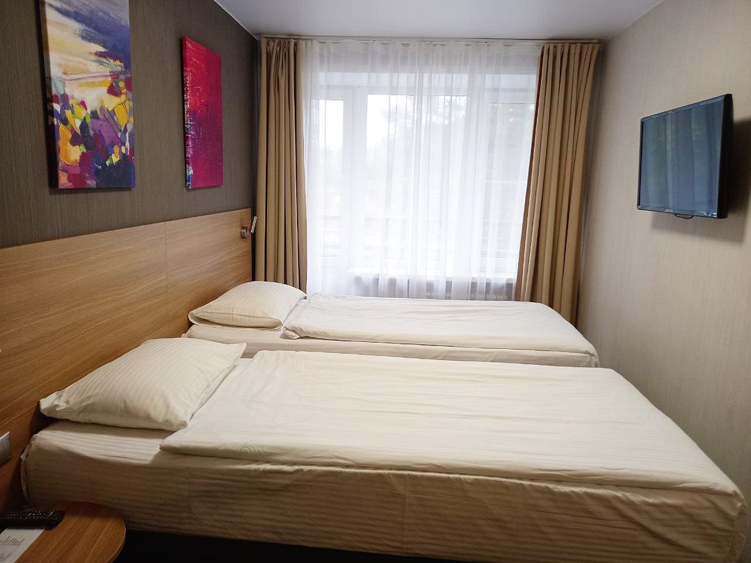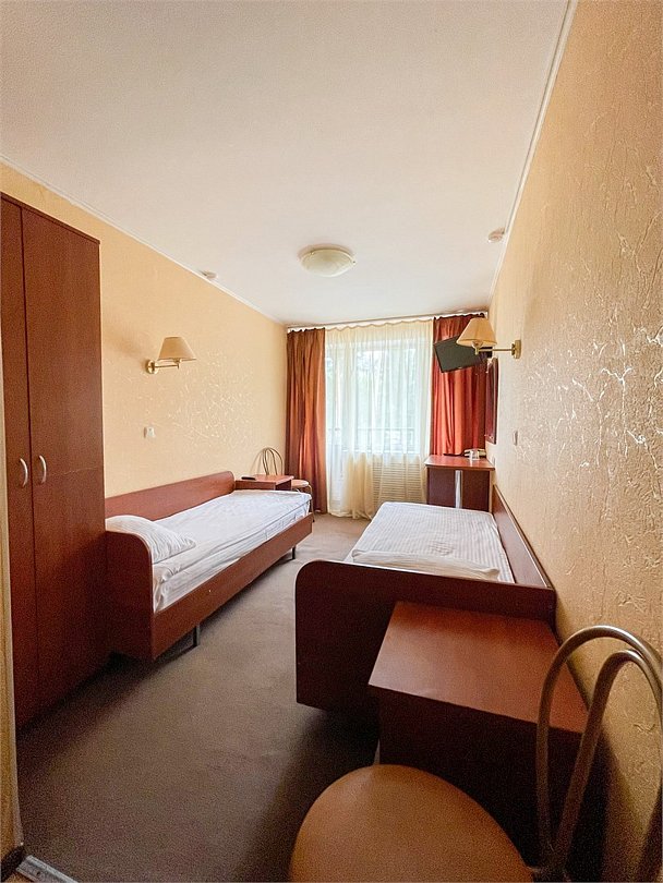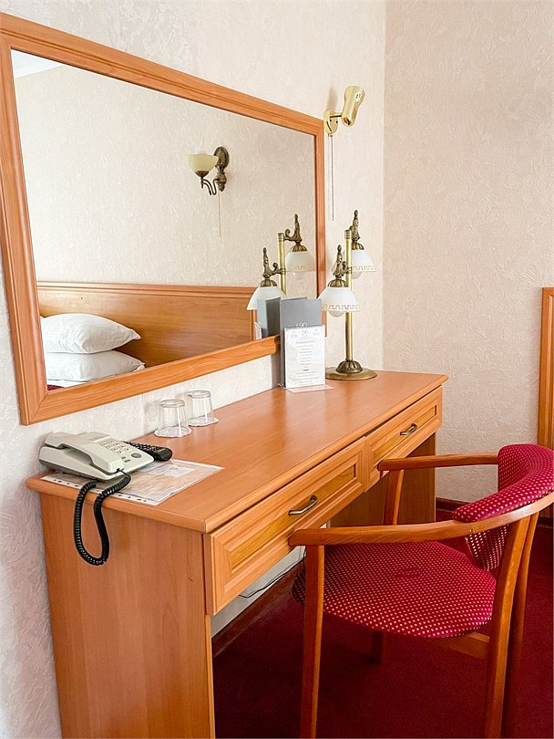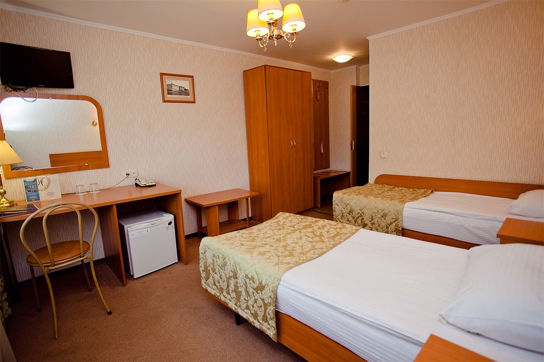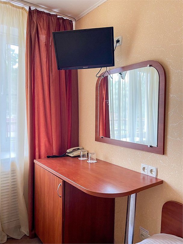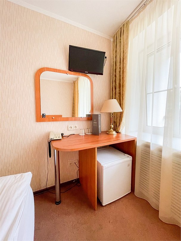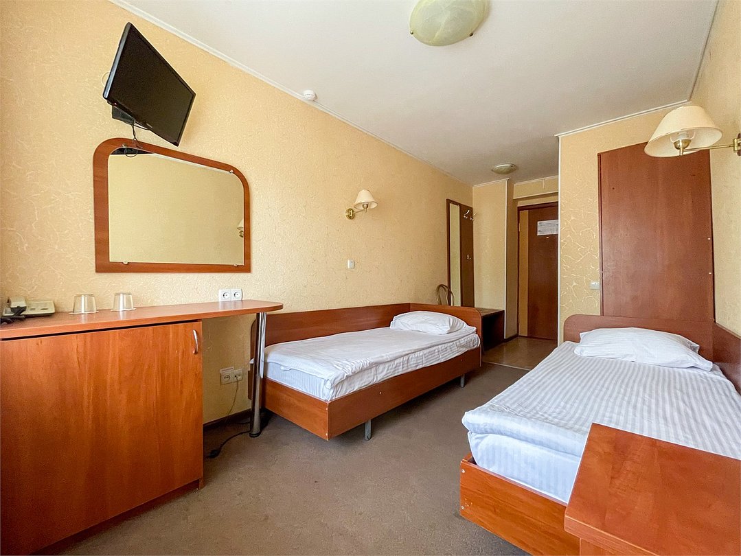 Однокомнатный номер площадью 13,2 кв.м без кондиционера. В номере две односпальные кровати, стол с зеркалом, шкаф, плазменный телевизор, холодильник, телефон. В ванной комнате: душ, фен.Услуги и удобства