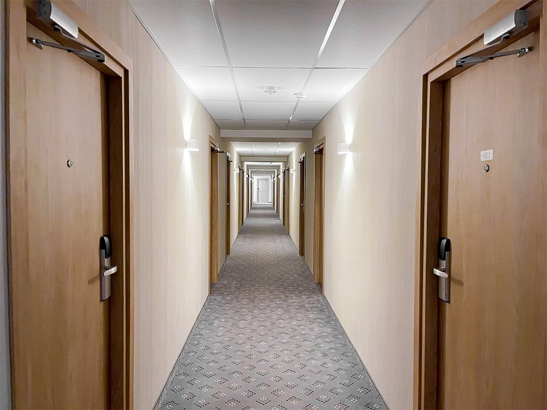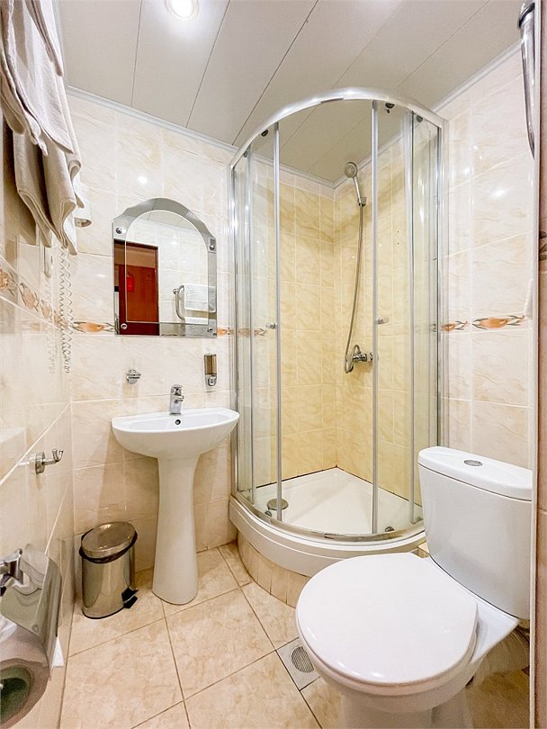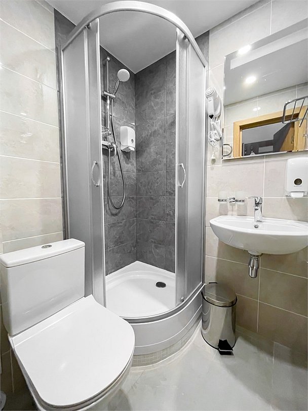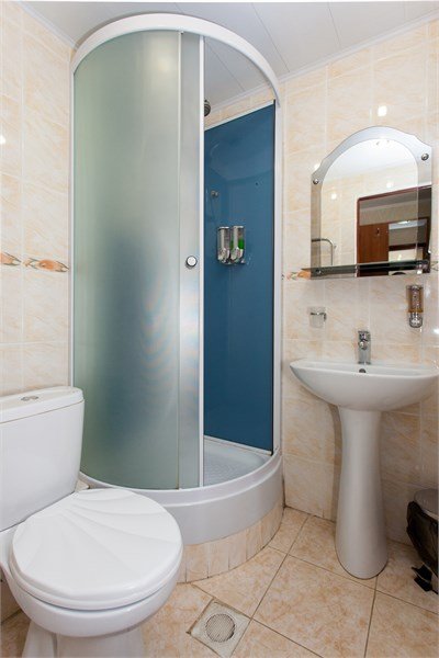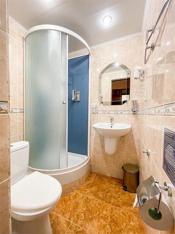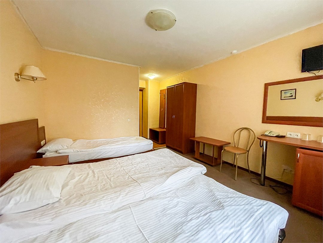 Однокомнатный номер площадью 17 кв.м. В номере: 3 односпальные кровати (80*195), стол, плазменный телевизор, телефон, чемоданница, холодильник, душевая кабина, туалетные принадлежности.Услуги и удобства