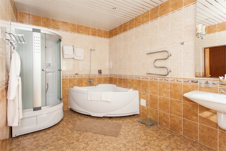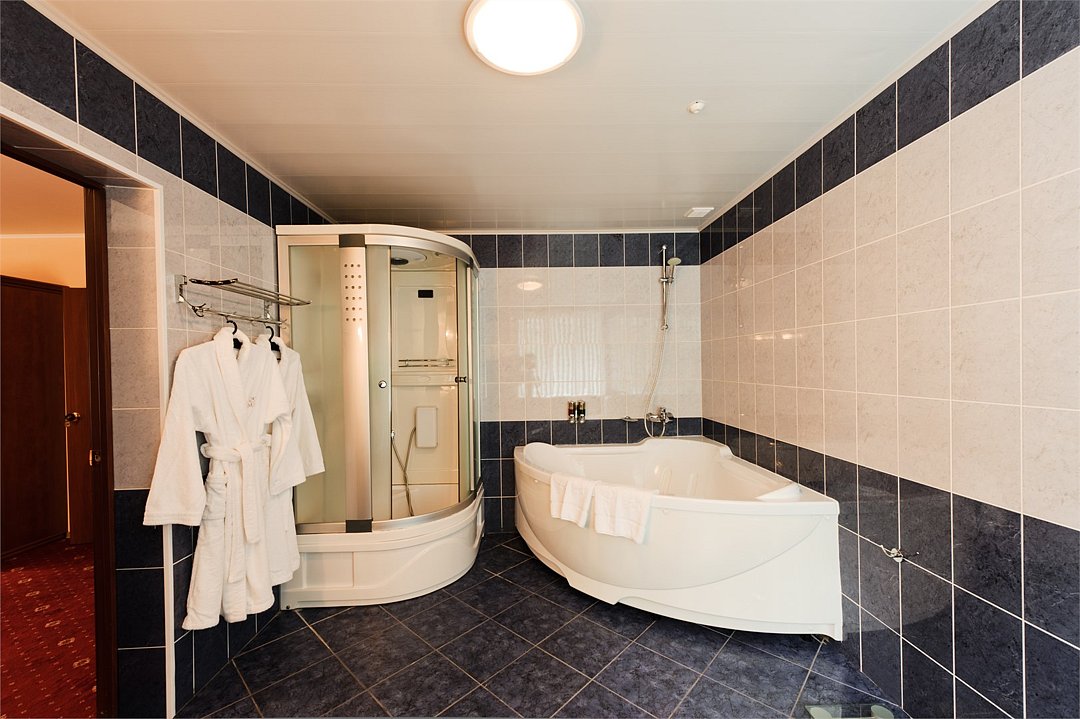 Однокомнатный номер площадью 45кв.м. В номере: двуспальная кровать "King size" (180*200), шкаф, диван, 2 кресла, туалетный стол с зеркалом, журнальный столик, ж/к телевизор, телефон, холодильник, кондиционер, багажница, сейф. В ванной комнате: биде, душевая кабина (с гидромассажем, радио и телефоном), фен, туалетные принадлежности, махровый халат, тапки.Услуги и удобства