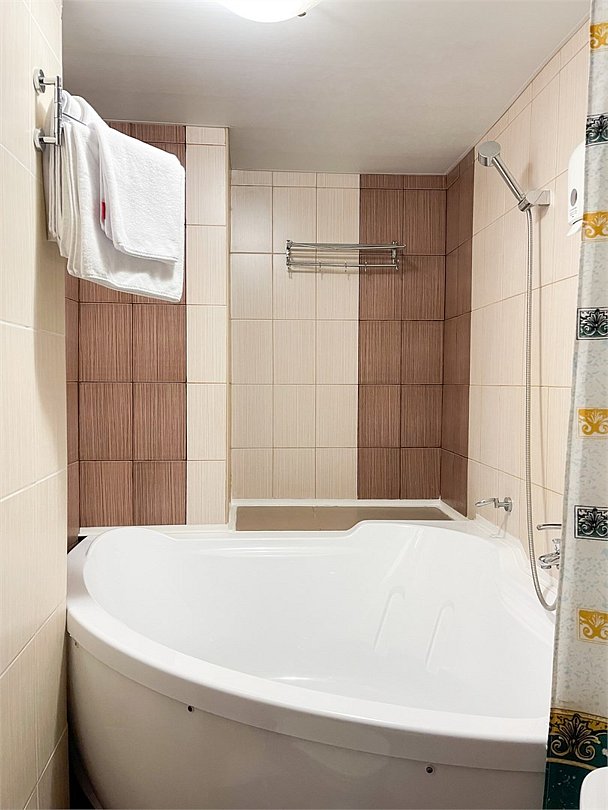 Однокомнатный номер площадью 13.2 или 17 кв.м. В номере: 1 односпальная кровать или 2 односпальные кровати (80*195), стол, холодильник, телевизор, телефон, шкаф, чемоданница, тапочки. В ванной комнате: душевая кабина, фен.Услуги и удобства