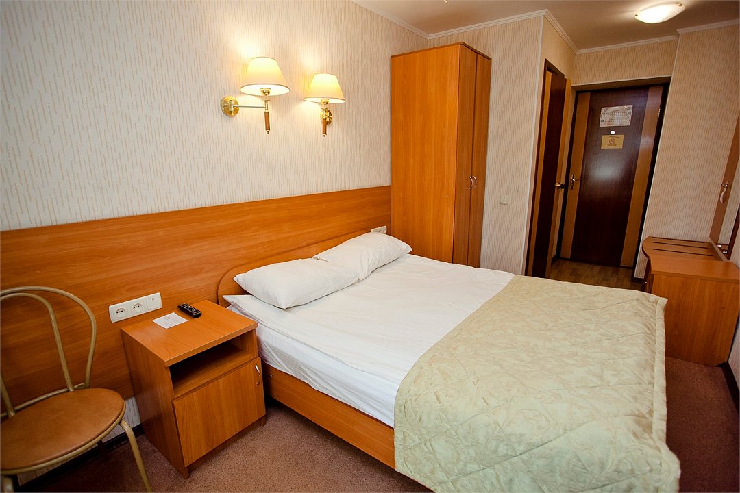 Однокомнатный номер площадью 17 кв.м. Расположен на 4 этаже. С кондиционером. В номере: кровать трансформер (две односпальные кровати или одна двуспальная кровать), стол, телевизор, телефон, холодильник, фен, полка для багажа, душевая кабина, туалетные принадлежности, тапочки.Услуги и удобства