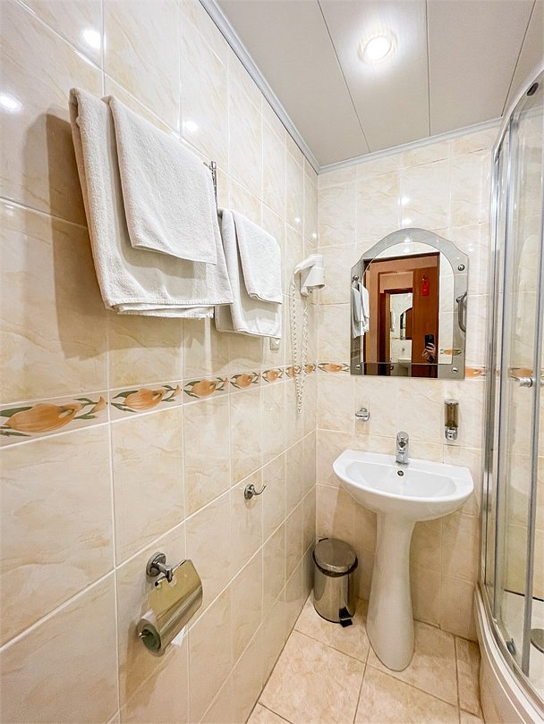 Однокомнатный номер площадью 13.2 Расположен на 4 этаже. С кондиционером. В номере: 1 односпальная кровать или 2 односпальные кровати (80*195), стол, холодильник, телевизор, телефон, шкаф, чемоданница, тапочки. В ванной комнате: душевая кабина, фен.Услуги и удобства