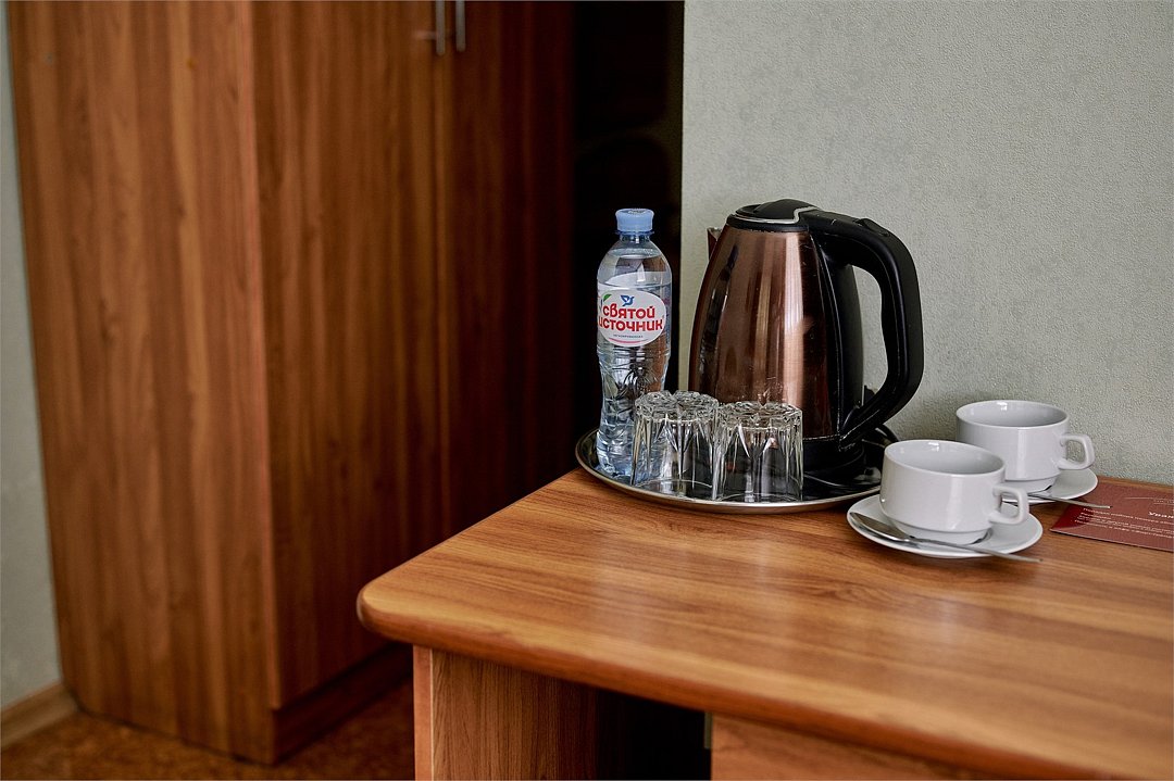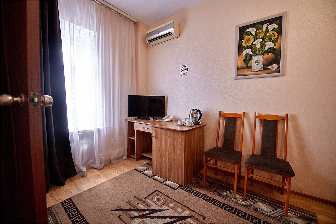 Wi-Fi, телефон, кондиционер, светильник, фен, ванная комната, душевая кабина, санузел, халаты, банные полотенца, тапочки, двуспальная кровать, две полутораспальные кровати, стулья, шкаф для одежды, вешалки, письменный стол, багажная тумба, зеркало, обслуживание номеров, информационная карта, меню, унитаз, отопление, вид на город, кулер на этаже, вид во двор, стаканы, стул, стол, тумба, туалетные средства, туалет, цифровое тв, внутренний телефон, телевизор с плоским экраном, мини-холодильник, номер для некурящихВ номере