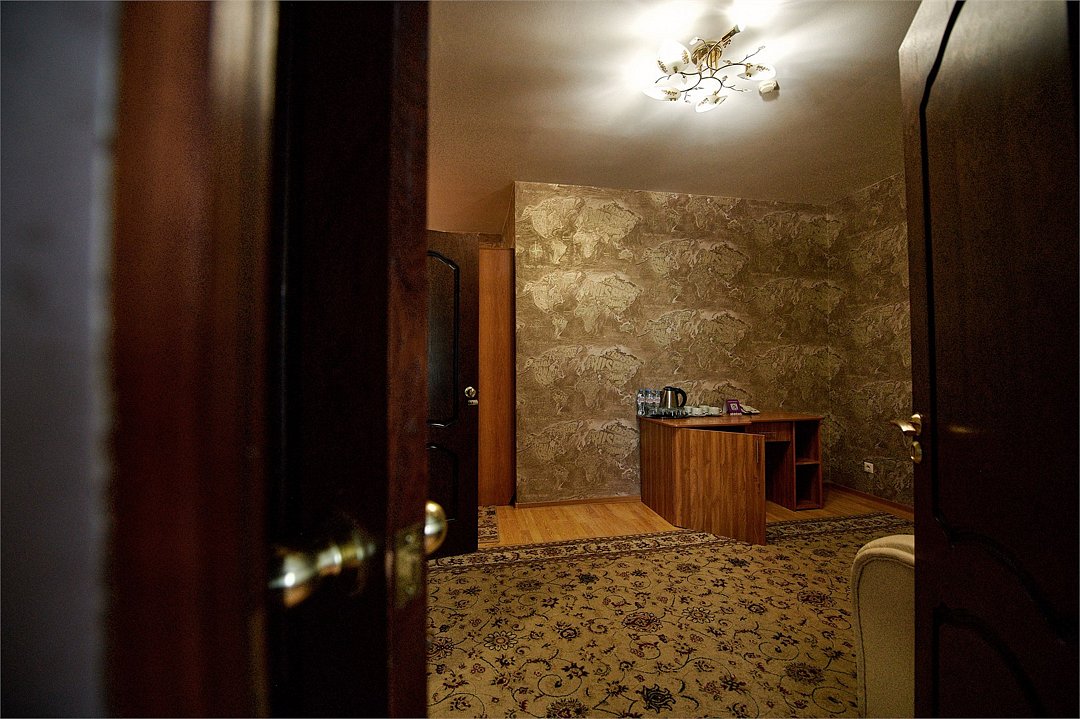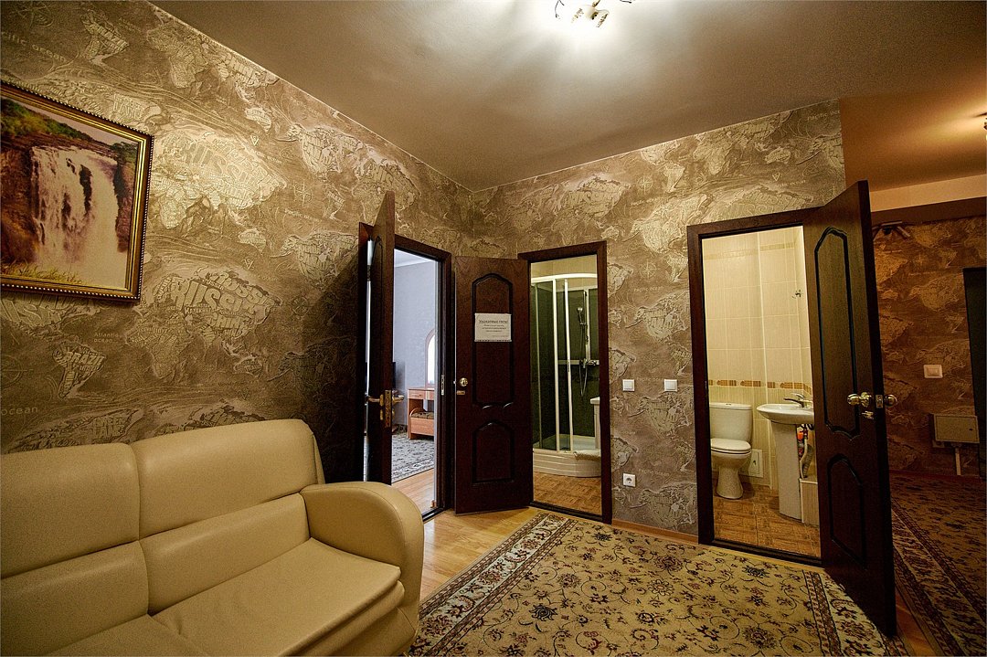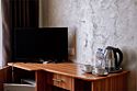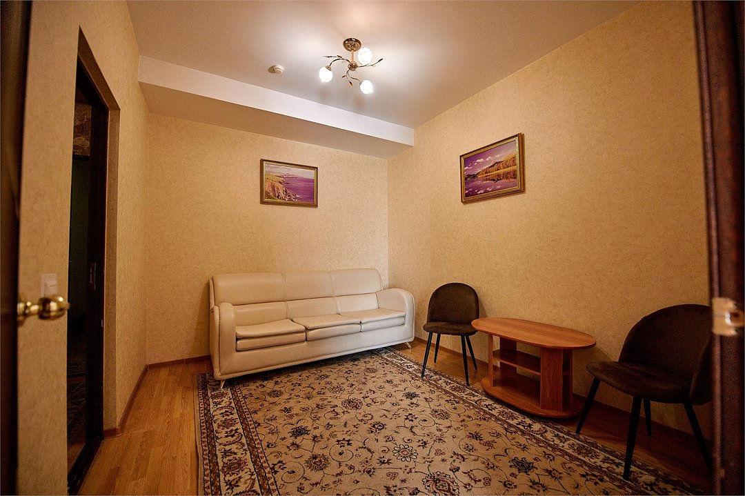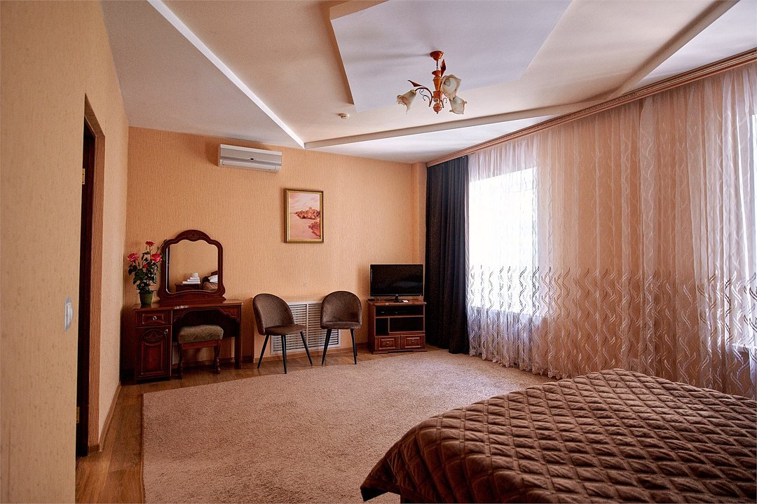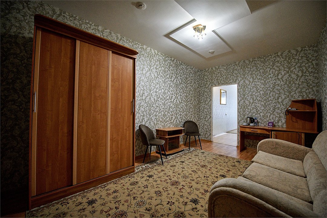 два телевизора, Wi-Fi, телефон, кондиционер, светильник, настольные лампы, фен, ванная комната, душевая кабина, санузел, халаты, банные полотенца, тапочки, гигиенические средства, двуспальная кровать, диван, стулья, шкаф для одежды, вешалки, письменный стол, багажная тумба, зеркало, комод, ковер, две комнаты, набор посуды, обслуживание номеров, информационная карта, меню, унитаз, раковина, косметическое зеркало, питьевая вода, гостиная зона, ковровое покрытие, отопление, душ, вид на город, кулер на этаже, вид во двор, стаканы, столовые приборы, туалетный столик, стол, туалетный столик, туалетные средства, туалет, цифровое тв, внутренний телефон, телевизор с плоским экраном, мини-холодильник, номер для некурящихВ номере