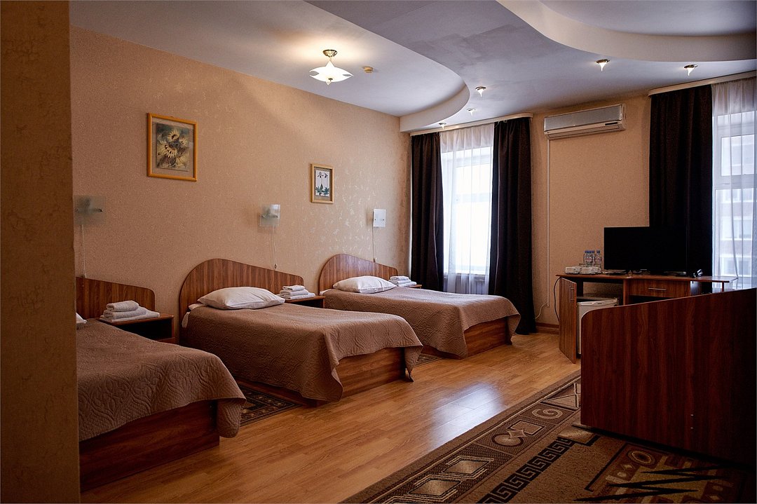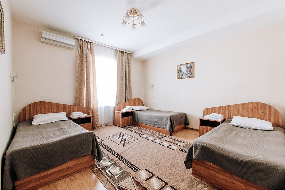 Wi-Fi, телефон, кондиционер, светильник, фен, ванная комната, ванна или душевая кабина, санузел, банные полотенца, тапочки, стулья, шкаф для одежды, вешалки, письменный стол, багажная тумба, зеркало, ковер, обслуживание номеров, унитаз, раковина, ковровое покрытие, отопление, вид на город, кулер на этаже, три односпальные кровати, вид во двор, стул, стол, туалетные средства, туалет, цифровое тв, внутренний телефон, телевизор с плоским экраном, мини-холодильник, номер для некурящихВ номере