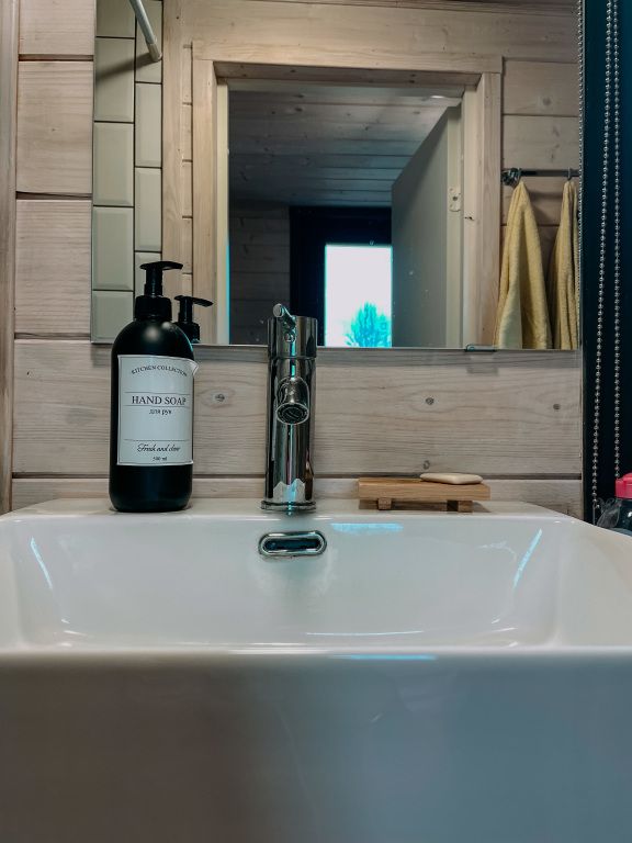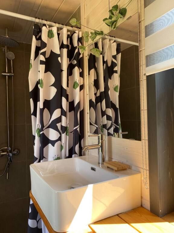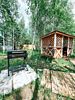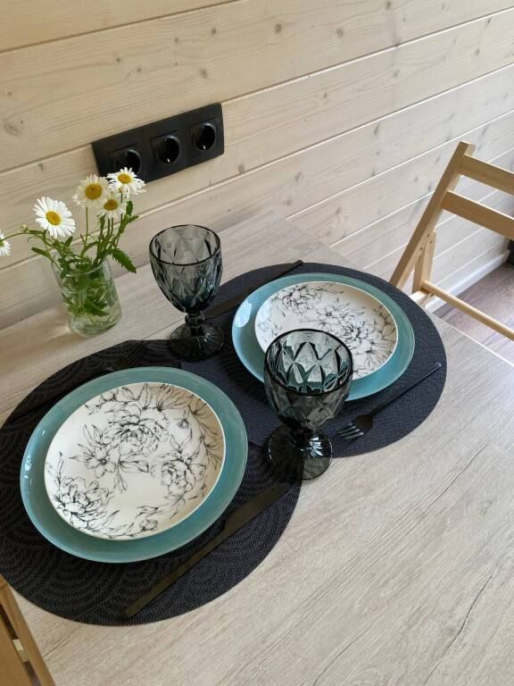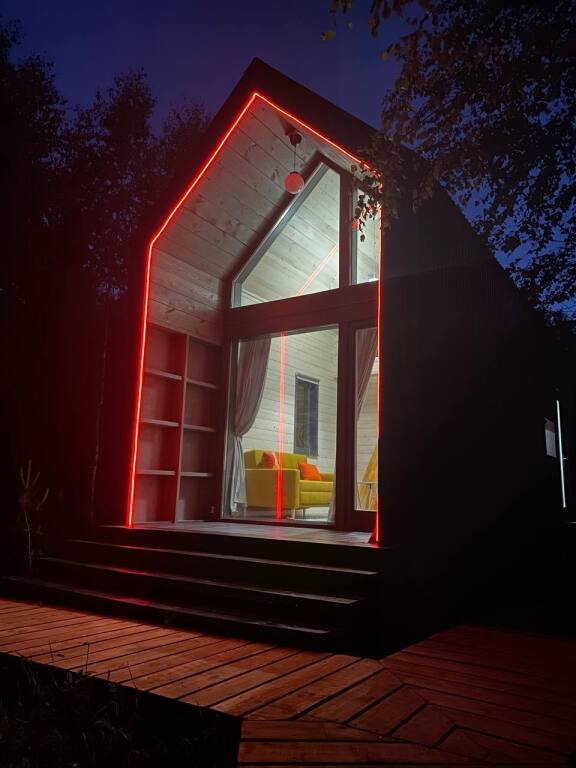 В домике предусмотрены все удобства: кровать двуспальная, диван раскладной 1,5 спальный, кухня со всей посудой, а также мини-печкой, собственный санузел c водой из скважины, мицеллярная вода, ватные диски и ватные палочки; мыло, шампунь, одноразовые тапочки, полотенца предоставляются, а также фен, в домике есть раздвижной стол и раскладные стульчики.