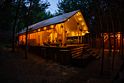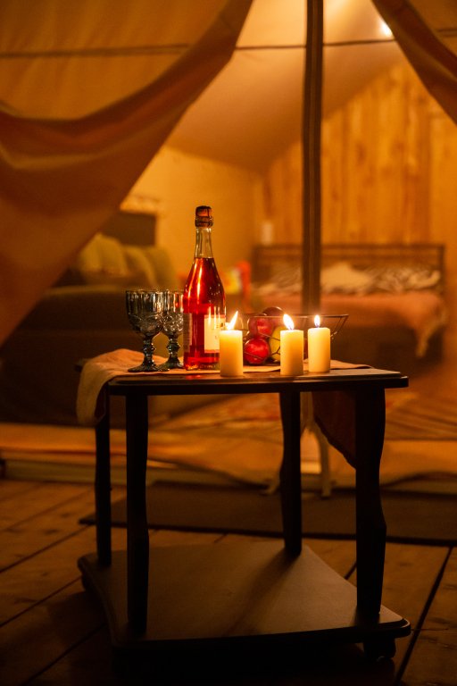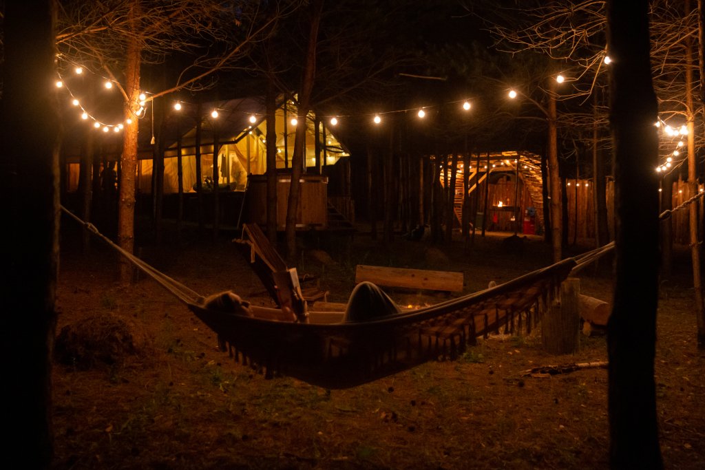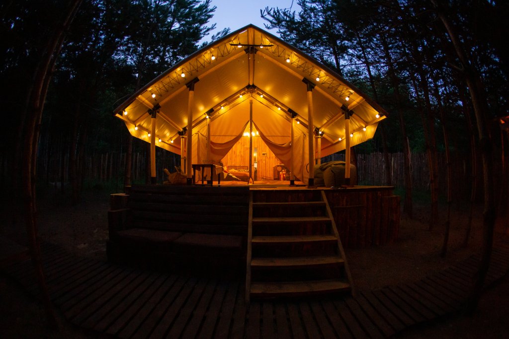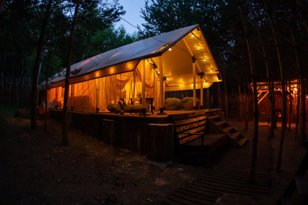 Круглогодичный Теплый Сафари-Тент в молодом сосновом лесу.