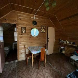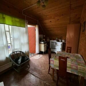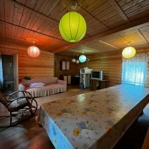 Располагает индивидуальным душем, туалетом, большим залом, кухонным уголком, 3 спальнями и раскладным диваном на первом этаже. Сдается только первый этаж. Возле коттеджа - зона барбекю, шашлычный крытый стол, чайная беседка.