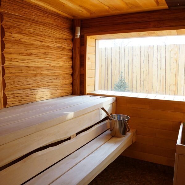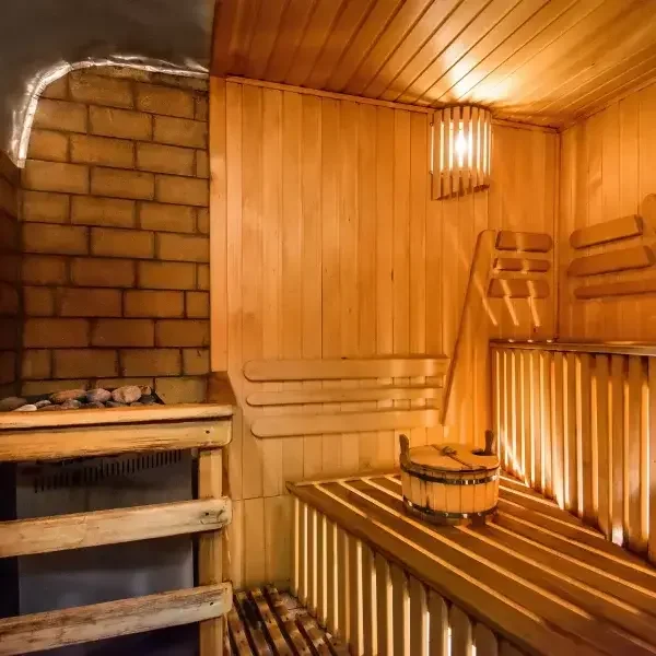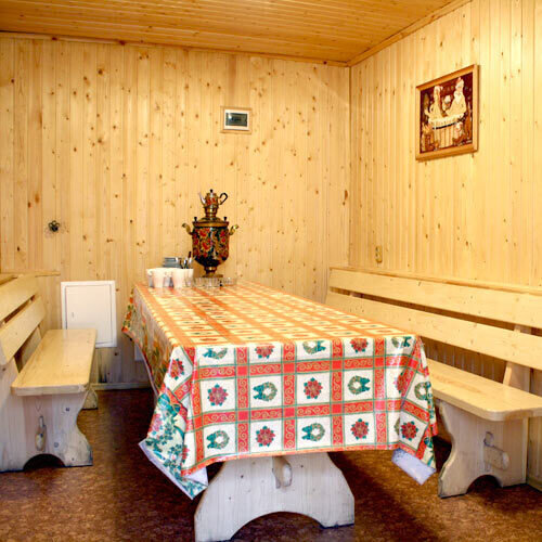 Русская баня с печкой на дровах и купелью с ледяной водой из артезианской скважины. Комната отдыха с большим столом и самоваром вмещает до 12 человек.
