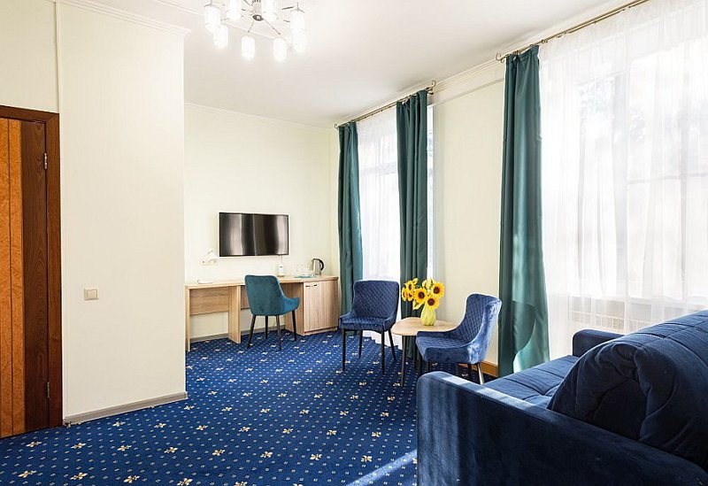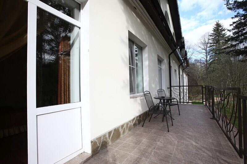 Шикарный двухкомнатный номер с балконом и аркой, из окна открывается вид на лес.