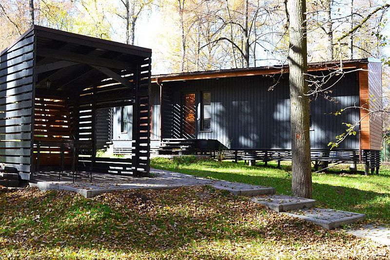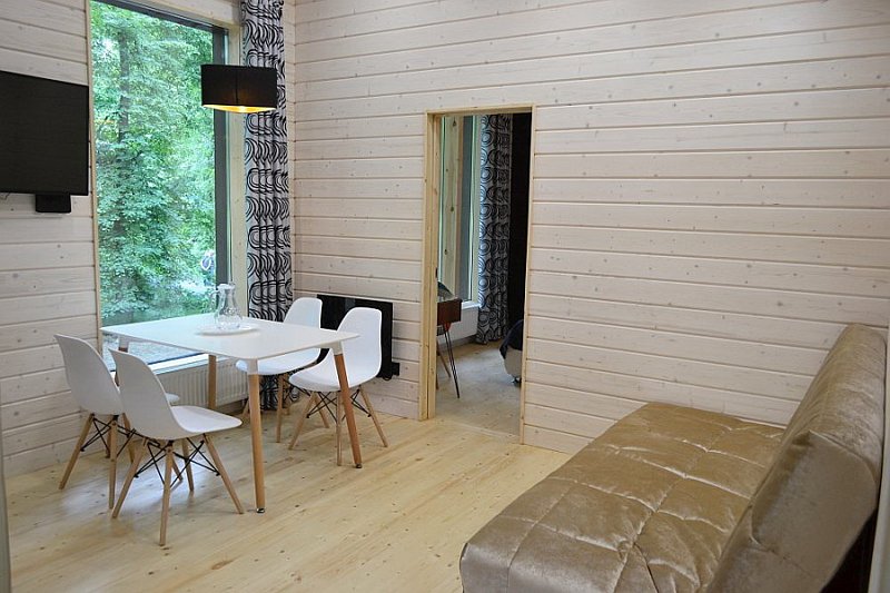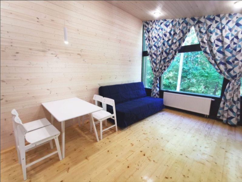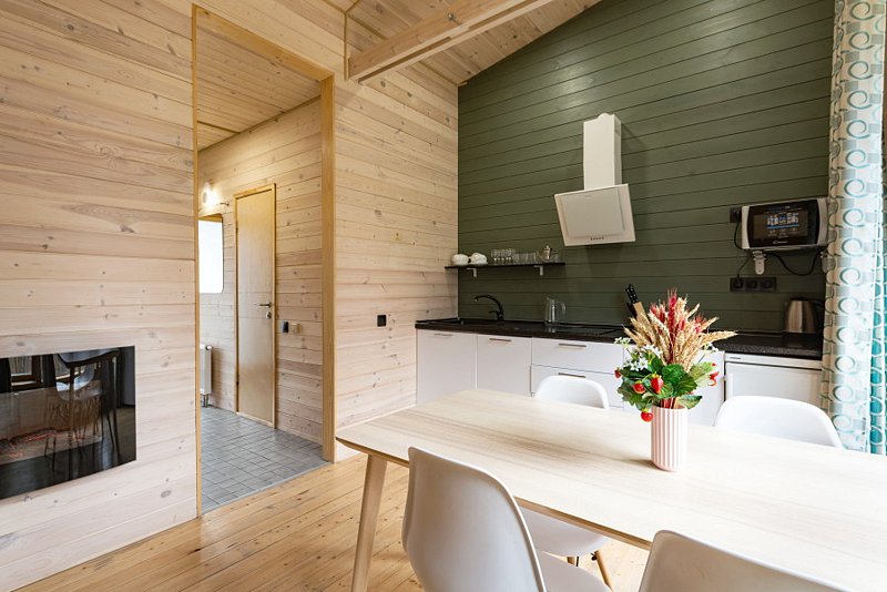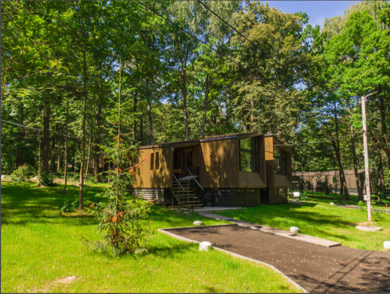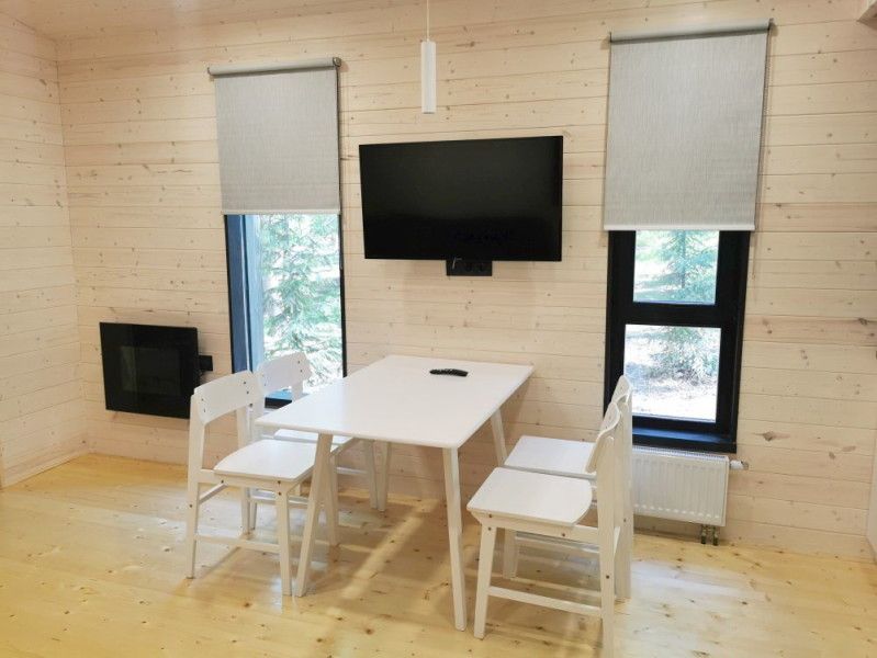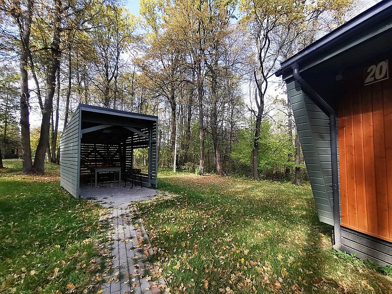 Односпальный коттедж в скандинавском стиле, с кухней и гостиной, сдвоенный и состоит из двух половинок, разделенных между собой техническим помещением. Около коттеджа площадка для барбекю, столом и лавочками, мангал.