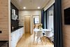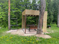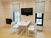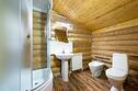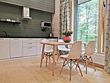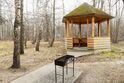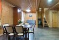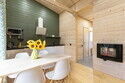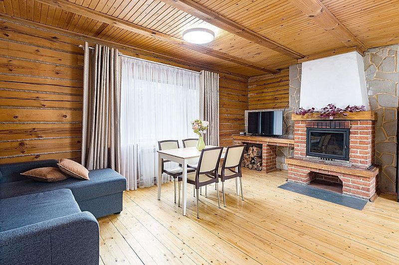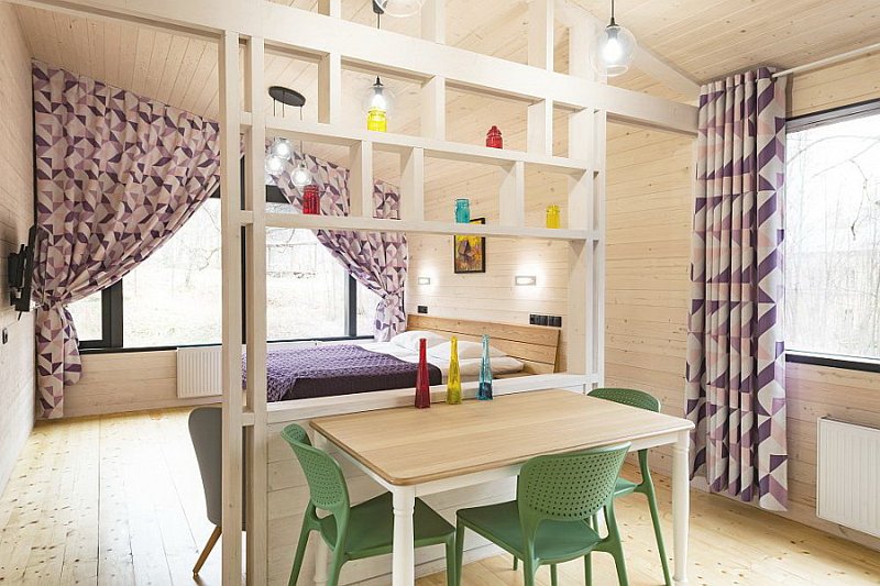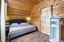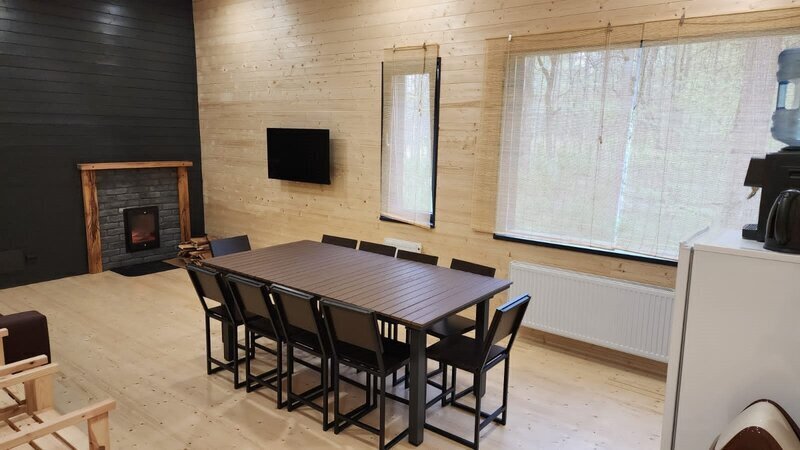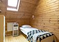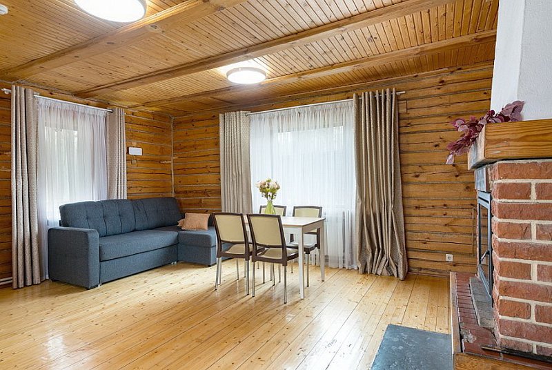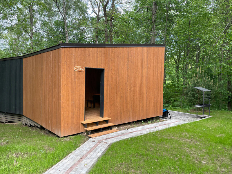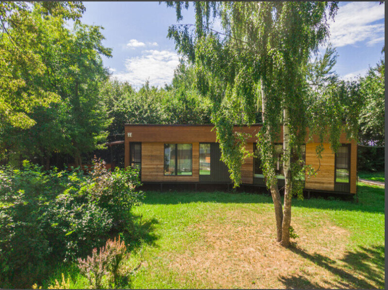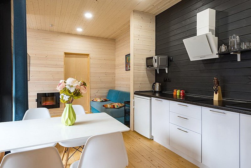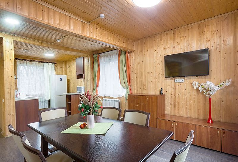 Односпальный коттедж в скандинавском стиле, с кухней и гостиной, сдвоенный и состоит из двух половинок, разделенных между собой техническим помещением. Около коттеджа площадка для барбекю, столом и лавочками, мангал.