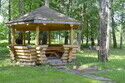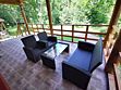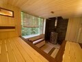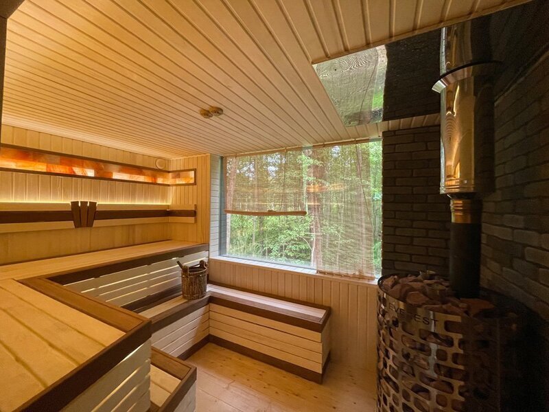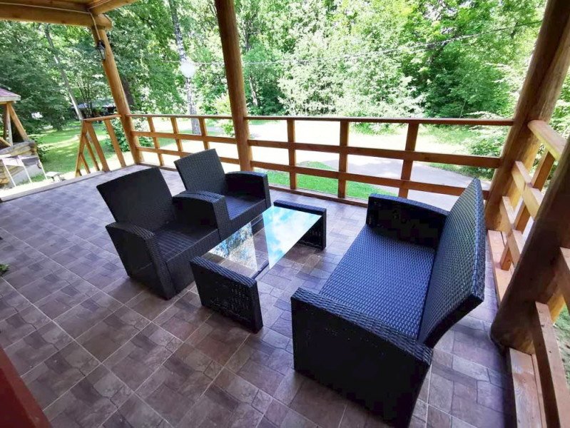 Коттедж с сауной расположен на высоком берегу с видом на реку Ока и примыкает к лесной зоне. Огорожен плетеным забором, имеет собственное патио со столом на 8 человек, и мангалом.