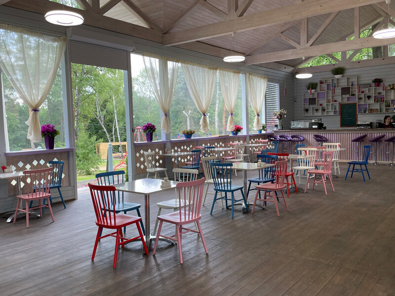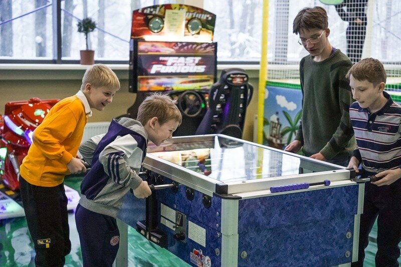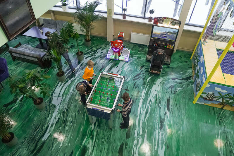 В вашем распоряжении аттракционы детского центра, зоопарк, уличные игровые площадки, волейбольное и футбольное поле, аренда спортивного инвентаря и настольных игр на протяжении всего дня. Фудкорт находится на первом этаже и предлагает возможность заказать блюда из ресторана и детское меню по предварительному заказу. Посетителям запрещается приносить свою еду и напитки. Также имеется возможность принести свой торт на фудкорт «Серпантина», при условии предварительного заказа и предоплаты.