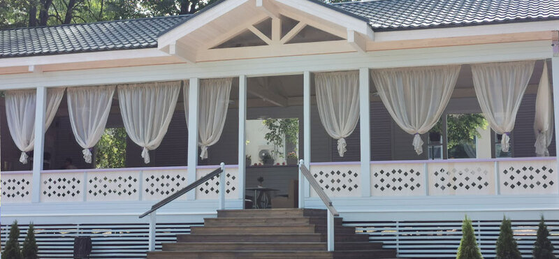 На веранде, современной, уютной и с видом на парк, площадью в 140 квадратных метров, есть возможность разместить до 60 человек в формате банкета. Отличное место для организации банкетов в период с мая по сентябрь. Веранда выполнена в светлых романтических тонах, имеет барную зону, окружена парком, декорирована живыми растениями.