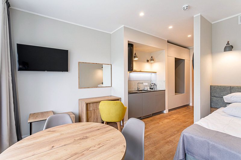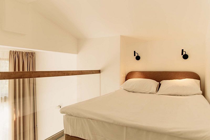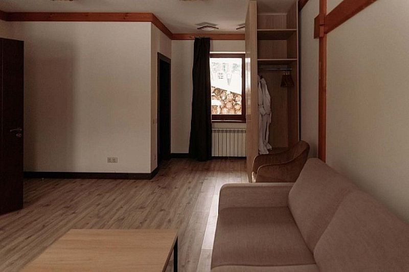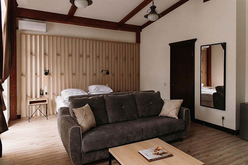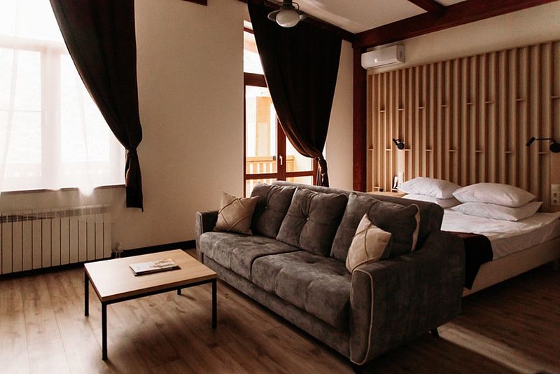 В сентябре я забронировала номер Apart с мансардой на третьем этаже 22 корпуса. Мне номер понравился, но сразу хочу предупредить: номер двухуровневый, на втором этаже спальня, взбираться туда нужно по ооочень крутой лестнице, так что внимательно посмотрите фото на сайте, по силам ли вам такой подъем. В остальном номер удобный: внизу диван, кухонная зона и то, что мне понравилось больше всего: большая открытая терраса с прекрасным видом на окрестности. На террасе столик и два удобных кресла.