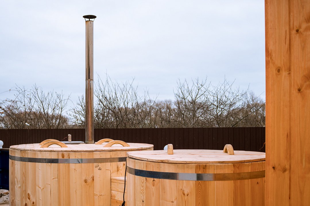 Японские бочки офуро на улице с горячей и холодной водой. На 3 человека каждая.