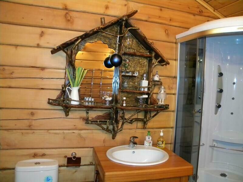Все элементы шале сделаны их алтайского кедра; бревна стен и обшивка потолка отшлифованы вручную. При строительстве шале применялся только ручной и электрический инструмент.